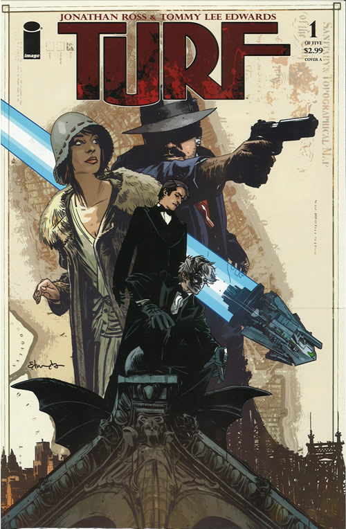 Image Comics' Turf issue 1 is like reading a Classics Illustrated story, but without that careful planning of art and text layout. This gives the impression the artwork was done first, then narrative and dialog text were slapped on top, creating an awkward, crowded, and often contentious marriage of both within panels too small to cleanly hold them. Some pages stretch to ten panels, which are then crammed with text, some of which is either unnecessary or could have been better accommodated by choosing a different page layout or approach. How Alan Moore's penchant for verbosity is craftily handled in comics comes to mind. So my question is why didn't Ross and Edwards do a better job of planning their graphic story layout? Jonathan Ross' story is ambitious and well written–for a novel–and Tommy Lee Edwards artwork captures the grit and flap of the roaring 1929 social scene with detailed precision–when you can see it.