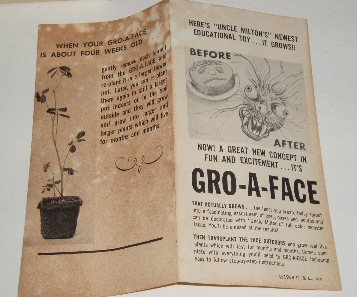 I'd buy this for the box alone! Look at that eye-popping illustration! I can already hear today's parents moaning and bitching about it in the aisles of TRU, in spite of it saying it's "an exciting hobby for the whole family." I don't get it, though. I know you're growing plants, but how the "face" part comes in, I'm not clear on. Looks like the box is missing the "decorator kit."