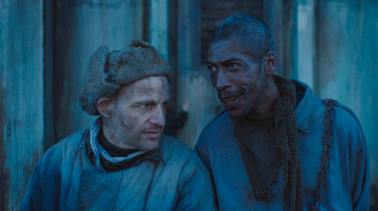 …the next story, which involves a rich man (Eric Godon) who wants to become richer, a daughter (Tanya Reynolds) he adores, and a creepy genius (Jan Bivjoet) who wants to sell his architectural plans. Strangely, this story is told by a father telling his daughter a bedtime story, which is even more strangely being told by one of the questionable sanitation guys picking up bodies and drinking gasoline. Again, I'm guessing here, but it would fit the fantasy element as Moya kicks around the point of view for us like an empty can. He definitely wants to play with us here, with timeframes, with the people in those timeframes, and the social malaise those people are swimming in. Is he saying these characters are why the apocalypse happened, in general? A society in decline? Or are we still inside the heads of those two buddies as they shoot the breeze?