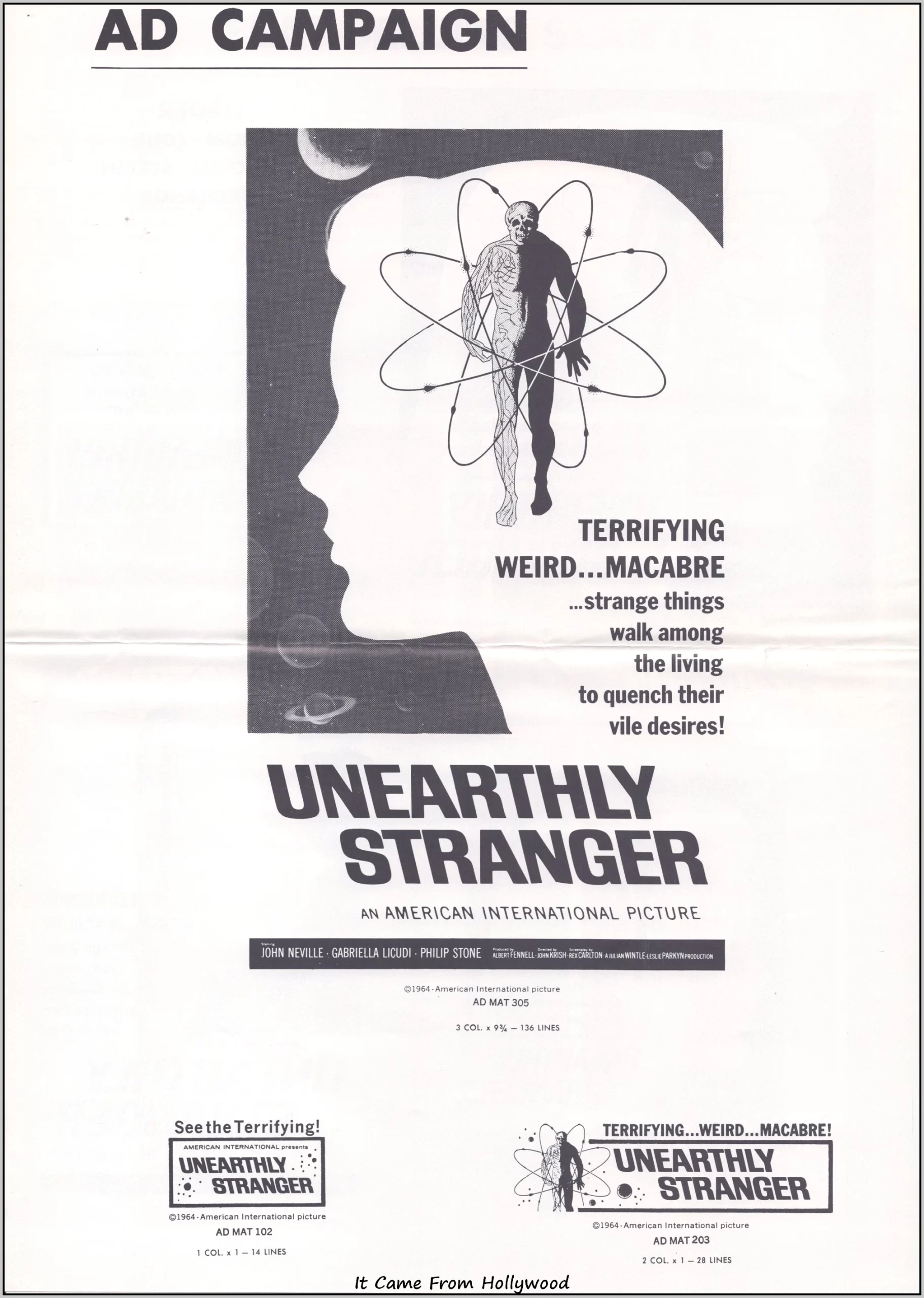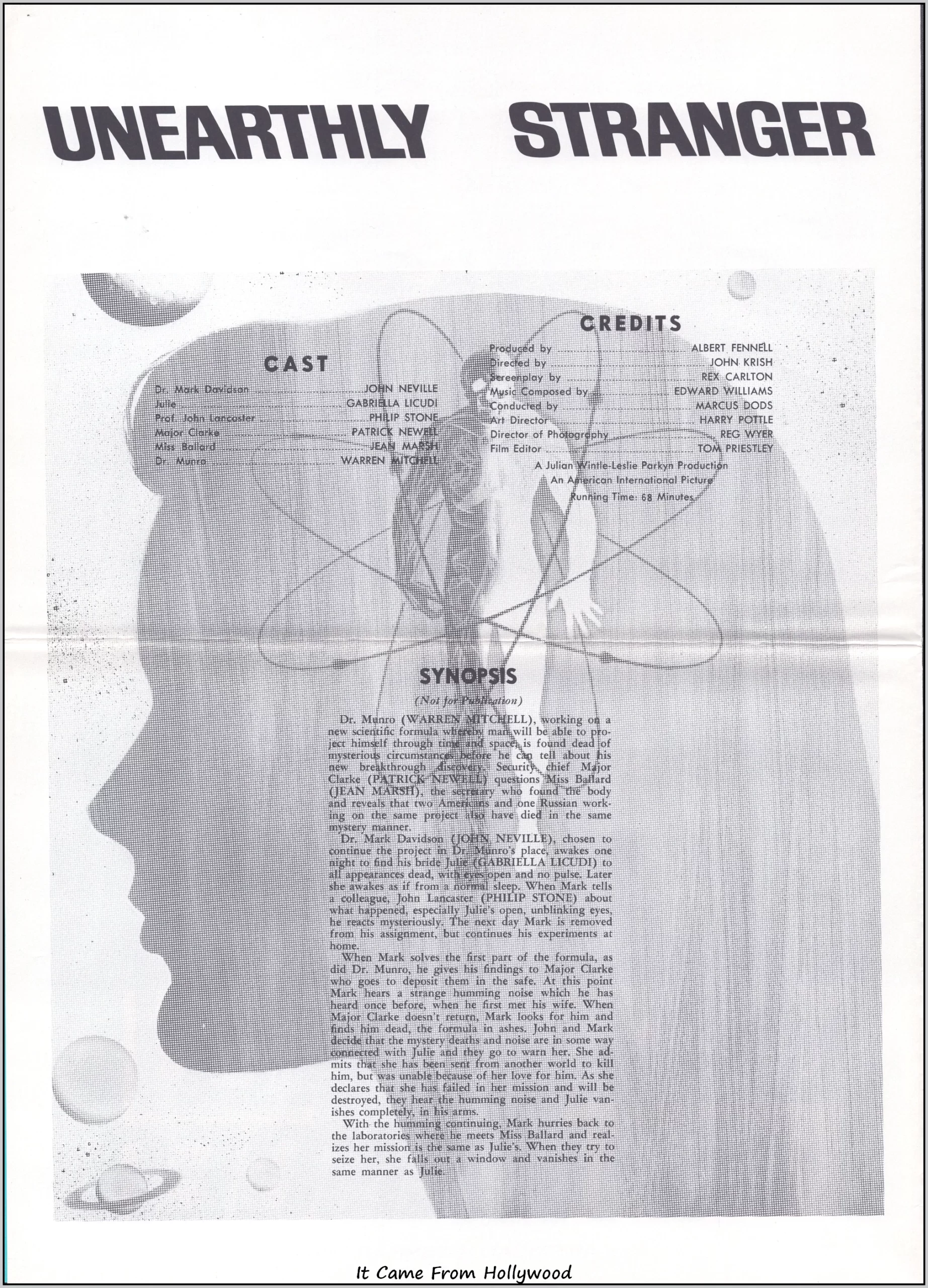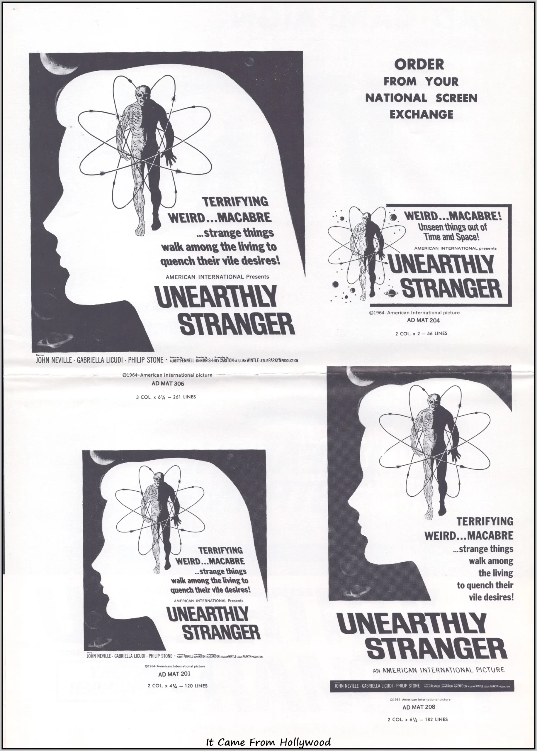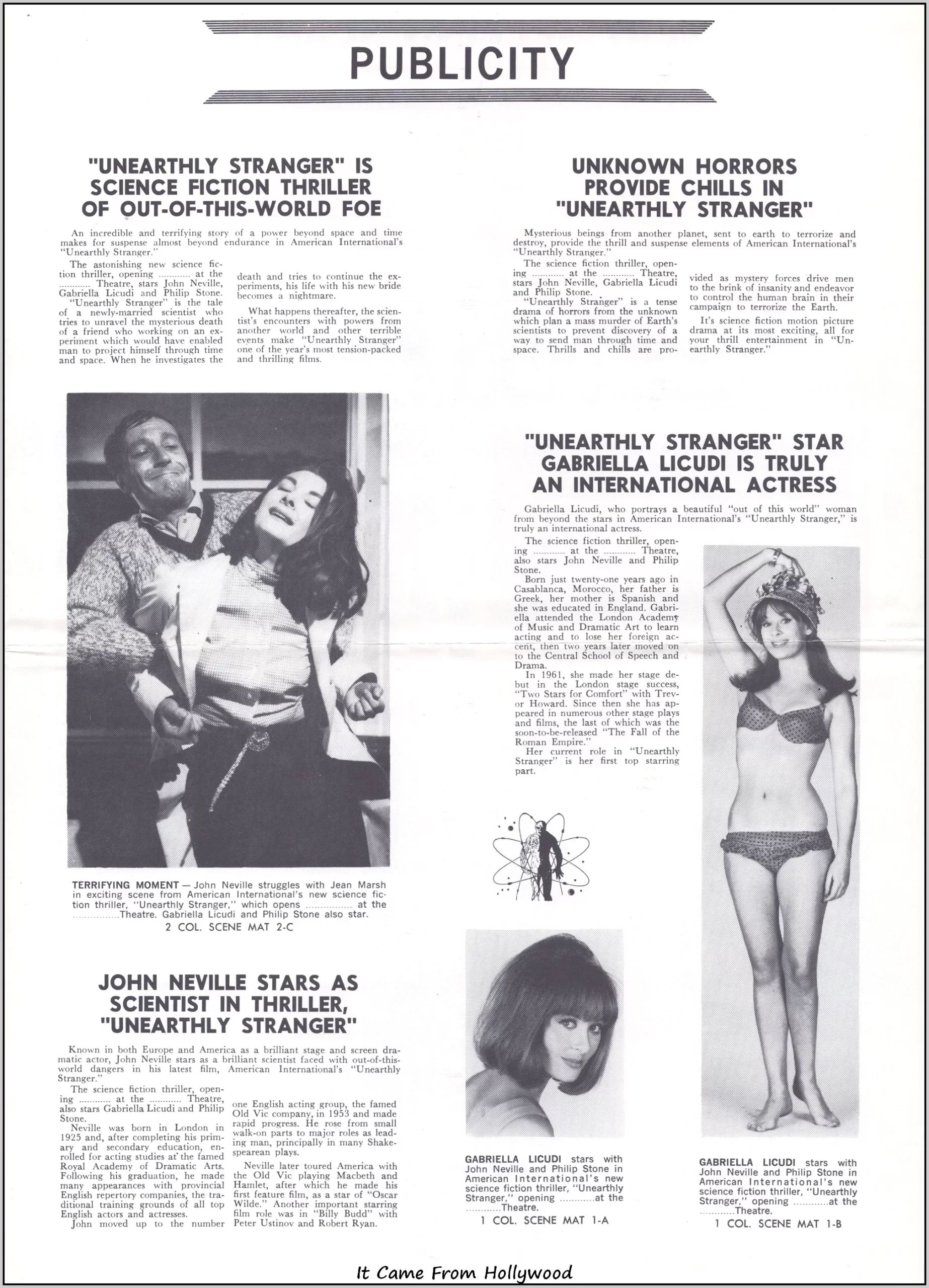 It Came From Hollywood sends along this six page AIP pressbook for the science fiction movie, Unearthly Stranger. Scientist marries a woman who may (okay, she is, but the characters don’t know it yet) be an alien from outer space to stop his research. From that simple premise, the movie works well within its budget and with solid acting and dialog, you can’t go wrong. While the Publicity page in the pressbook is on the skimpy side, you will notice, like in other pressbooks of this period, the actress is shown in something skimpy too. In fact, many pressbooks going back decades would always highlight the female leads within the contexts of beauty, glamour, and fashion. The guys, of course, maybe got a watch, shirt or luggage tie-in.