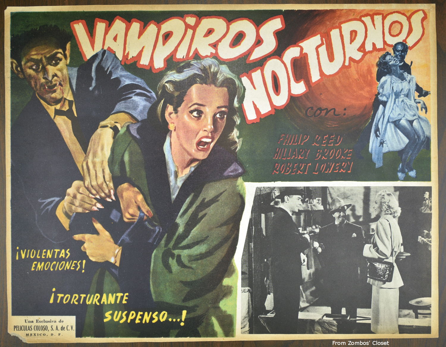 I'm not sure what movie this Mexican lobby card is for, but I wager it's Big Town After Dark (1947). Although Robert Lowery (Batman and Robin), who is listed on the card, doesn't show as being in this movie (according to IMDb). The card itself sports a superbly dark and scary illustration, one which I doubt depicts anything in the movie, though.