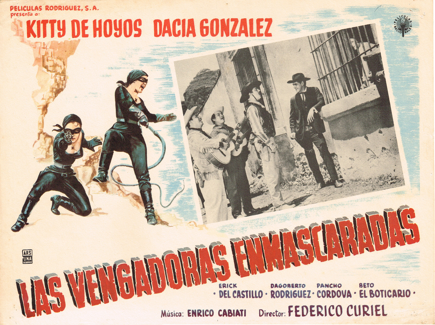 Looks like Zorro has some competition. Careful attention devoted to this lobby card's layout and colors draws your eyes first to the masked characters on the left while inferring their capabilities at providing suitable action for this southwestern actioner. Note the diagonal flow of the card and how two characters, a cowboy on the right and a masked rider on the left, are facing each other. Perhaps a love interest is being hinted at?