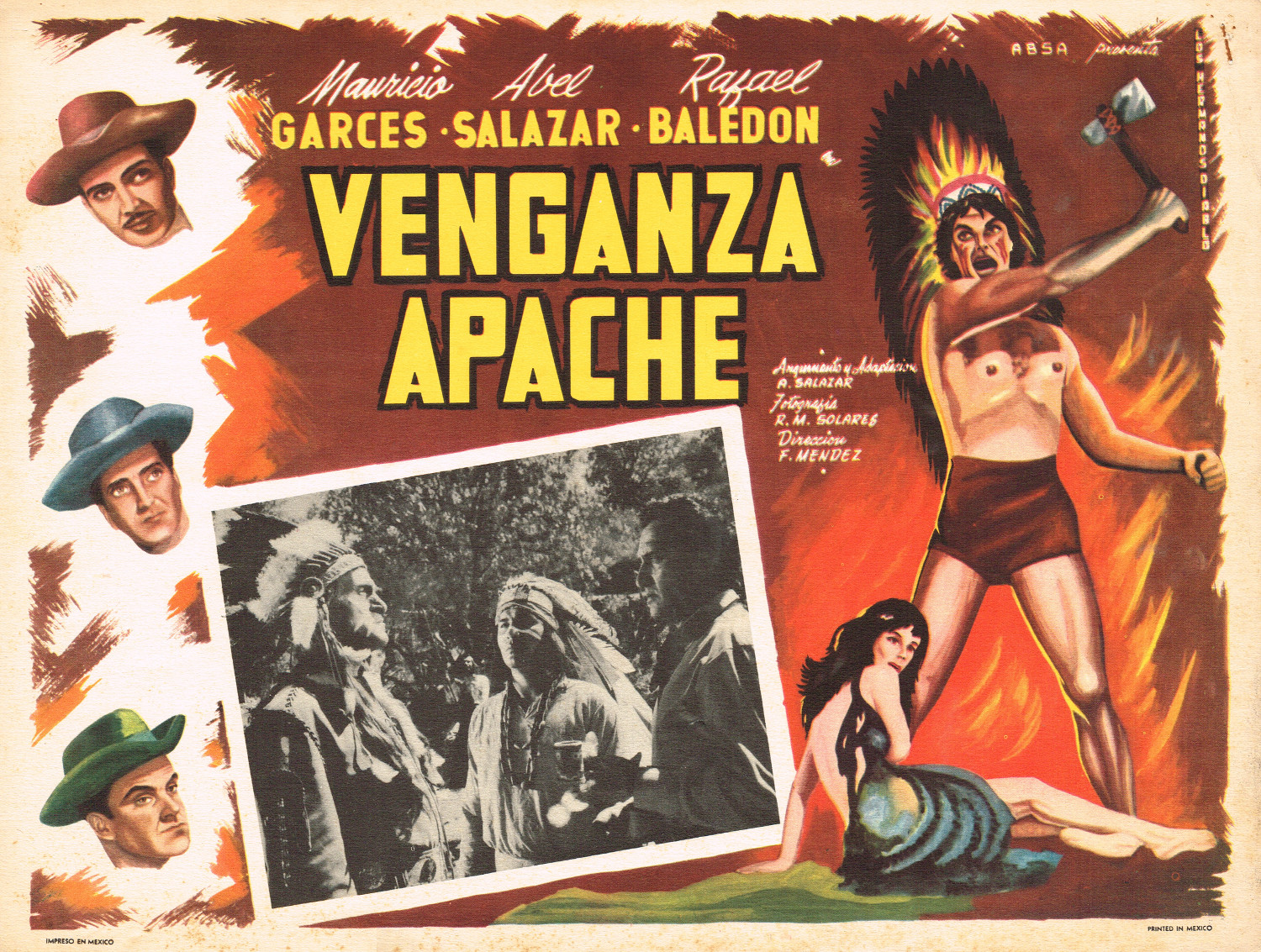 The usual elements of exploitative promotion are here: cowering, partially undressed female and a weapon held in an attacking posture. But due to an imbalance in the illustration, the ho-hum left side of this Mexican lobby card for Venganza Apache greatly lessens the impact of the more aggressive right half of the card. Also the proportions on all elements in the illustration aren't well thought out: one giant guy, three little heads, and a doll-sized woman. I hope the movie has more action than this lobby card and better thematic sense.