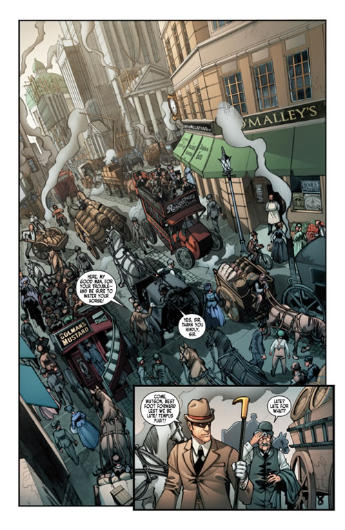 Look at the splash page (click to enlarge) and you’ll see a surprisingly neat and orderly crowd in the hustle and bustle. Doyle once remarked that London was “the great cesspool into which the loungers and the idlers are irresistibly drained.” Granted much of that cesspool was raised by fire in the first volume of Victorian Undead, in an effort to stop the zombies, but Fabbri’s penchant for commercial cleanliness throughout his panels spills over onto Holmes, whose “bohemian” habits and lifestyle, as Watson wrote, are nowhere to be seen.