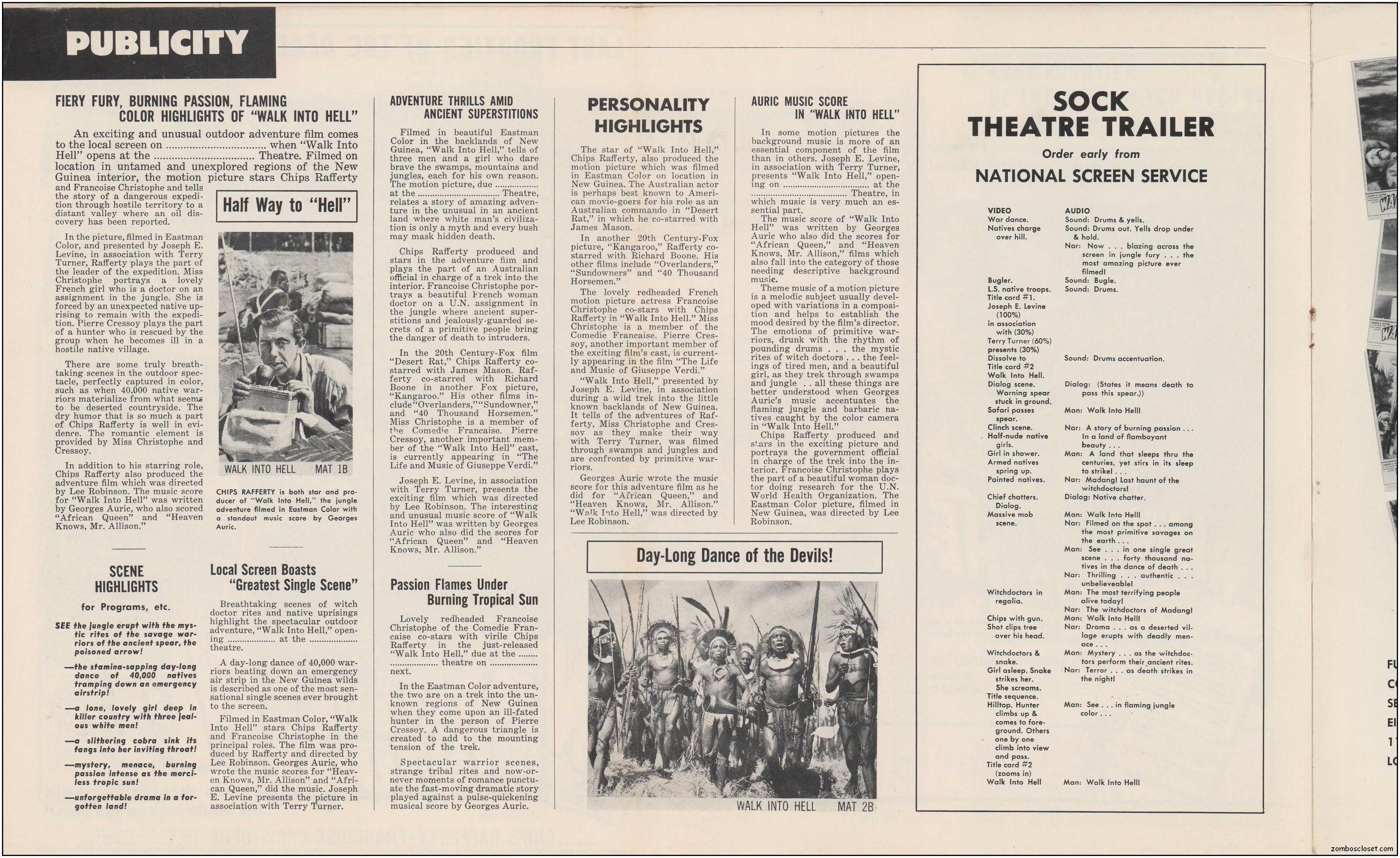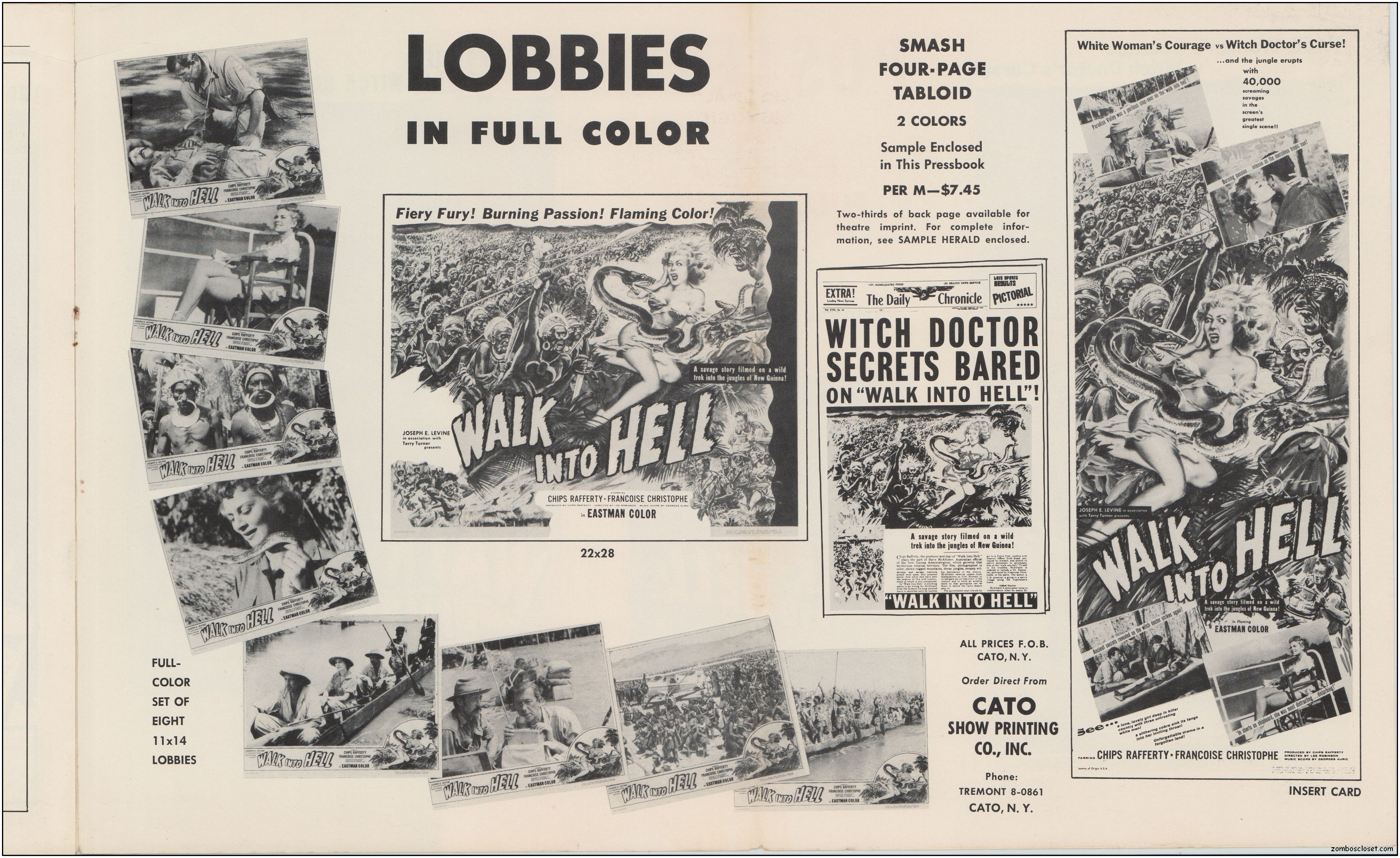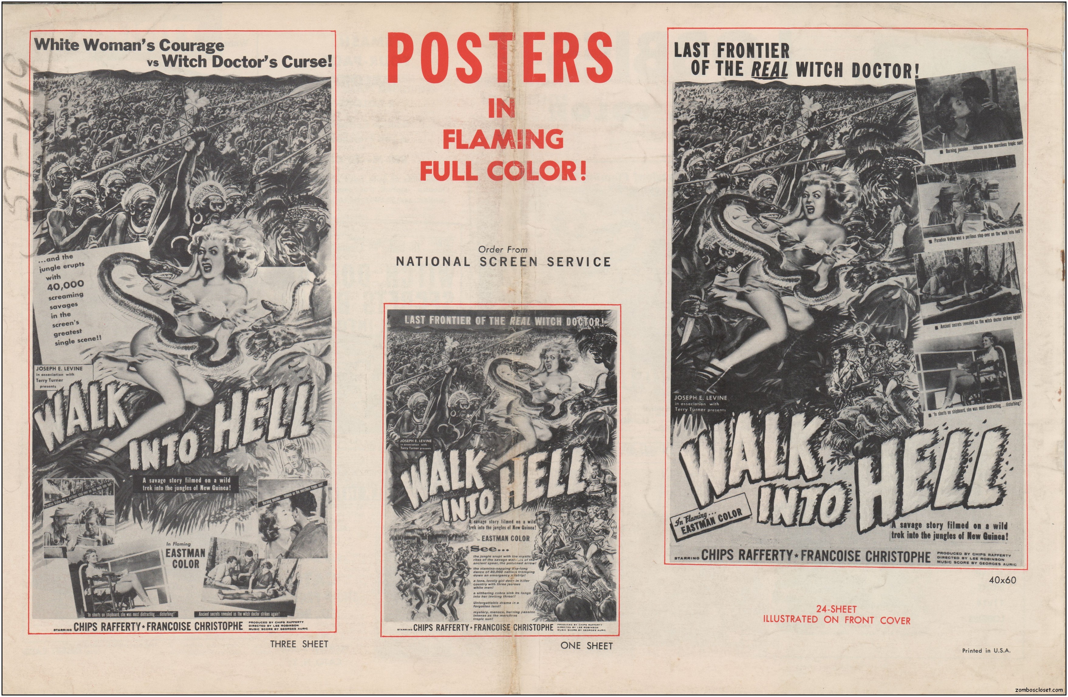 What’s a jungle without a witch doctor? At least that’s the theme in most jungle movies from the 1950s. See the movie herald. Of course it’s all about oil found in the jungle, which brings out the human wild beasts. The poster art focuses on a victimized white woman, scantily dressed of course, to sell butts in theater seats.