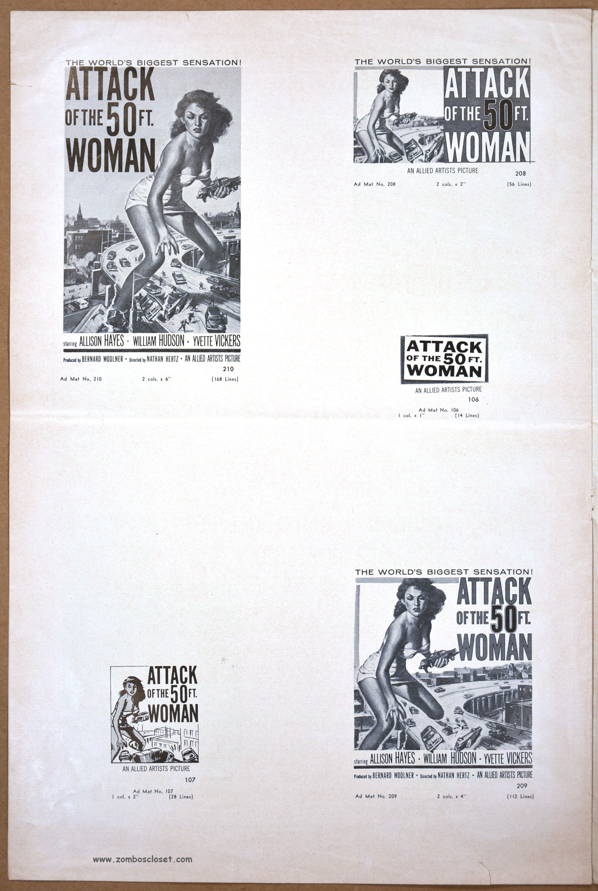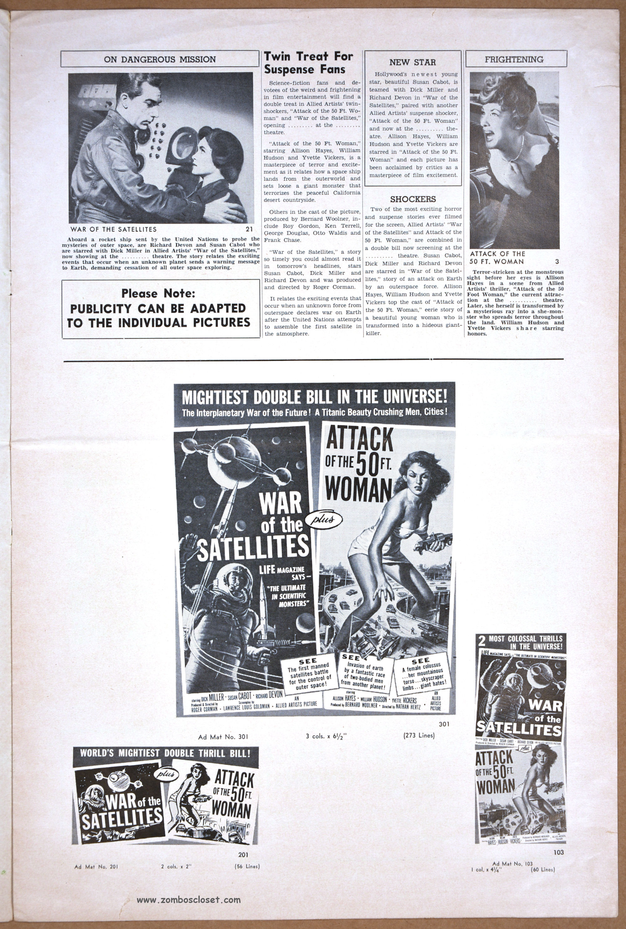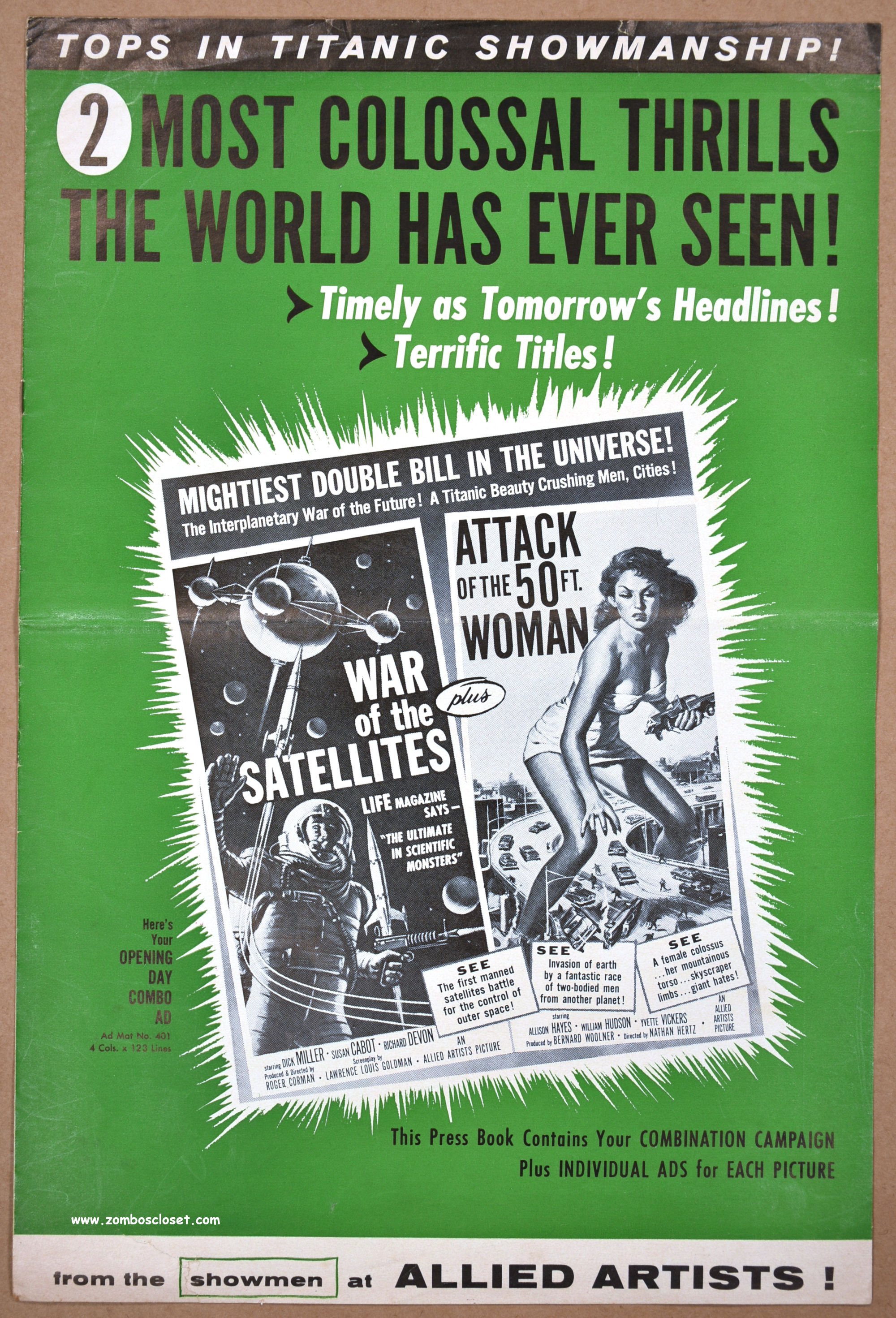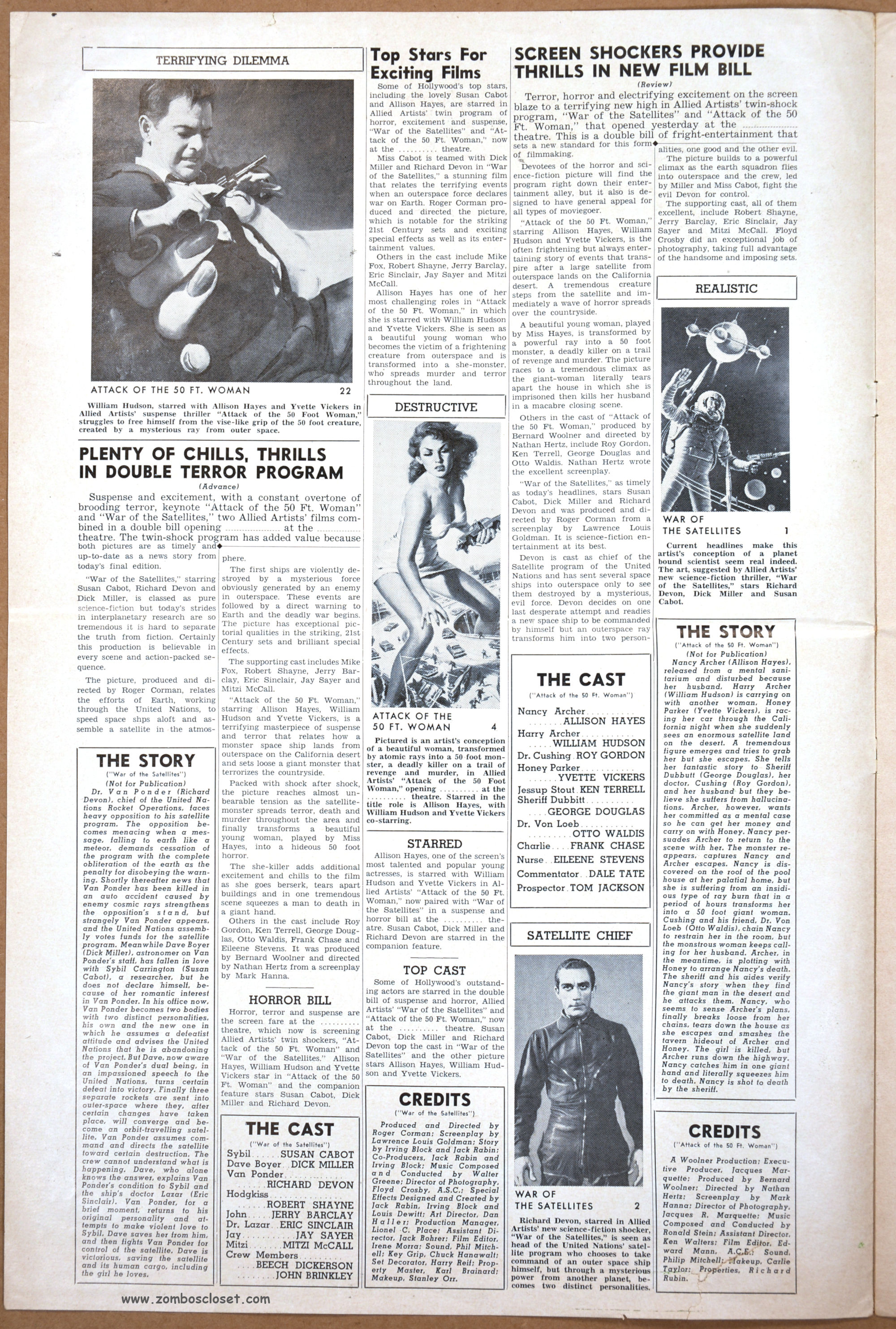Needless to say, the poster art for both of these movies is a lot more exciting than what was shown onscreen. But Attack of the 50FT. Woman is a classic, not so much for its shoddy special effects, but because it was a monsterkid staple that could stand up to (or was that more like provide fodder for?) repeated late-night viewings on a flickering black and white television set. Corman’s cheapie, War of the Satellites, gave us Dick Miller. What more do you need?
