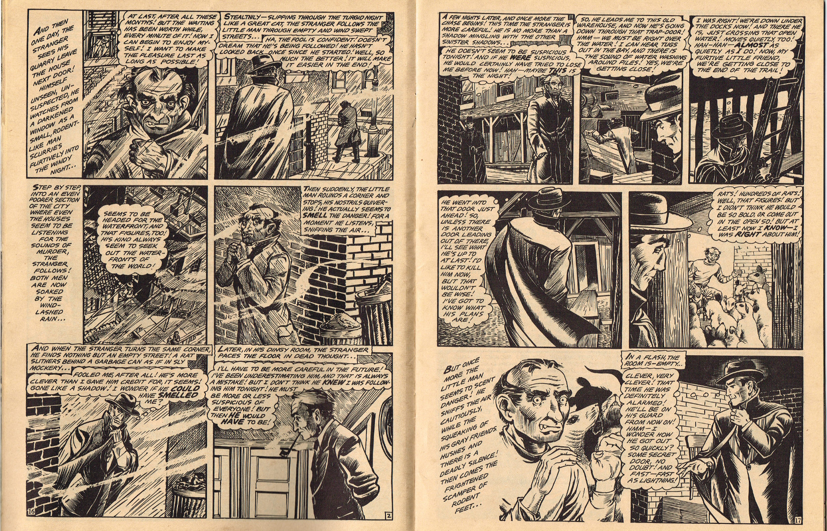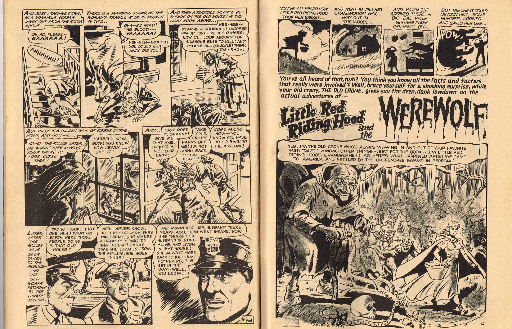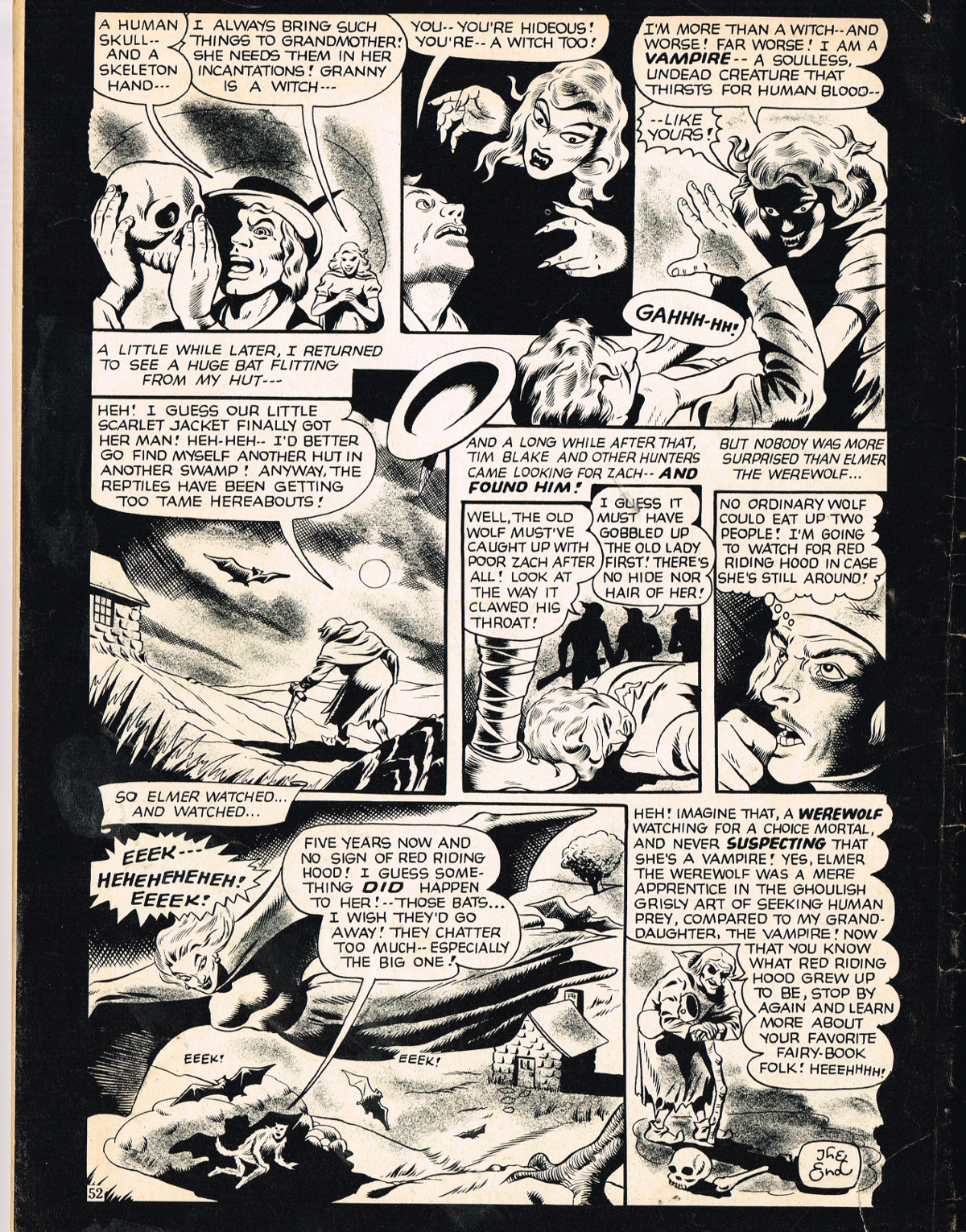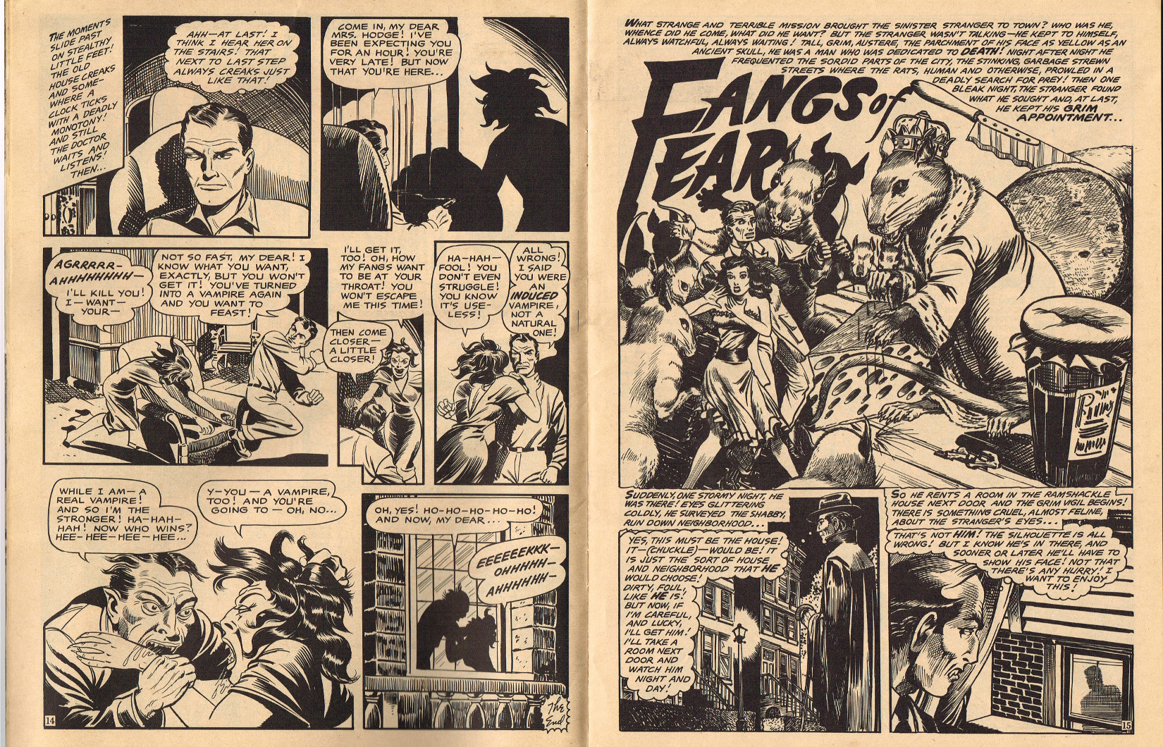 Gruesome metamorphoses abound in issue 11, 1966, of Weird magazine. And scrumptious illustration too (for the morbidly-minded, of course). Voracious spiders get their fill, vampires put the bite on, the rat king gets a nibble, and a coffin shares its thoughts. Boy, they really should ban this stuff. It will warp young minds for sure.
