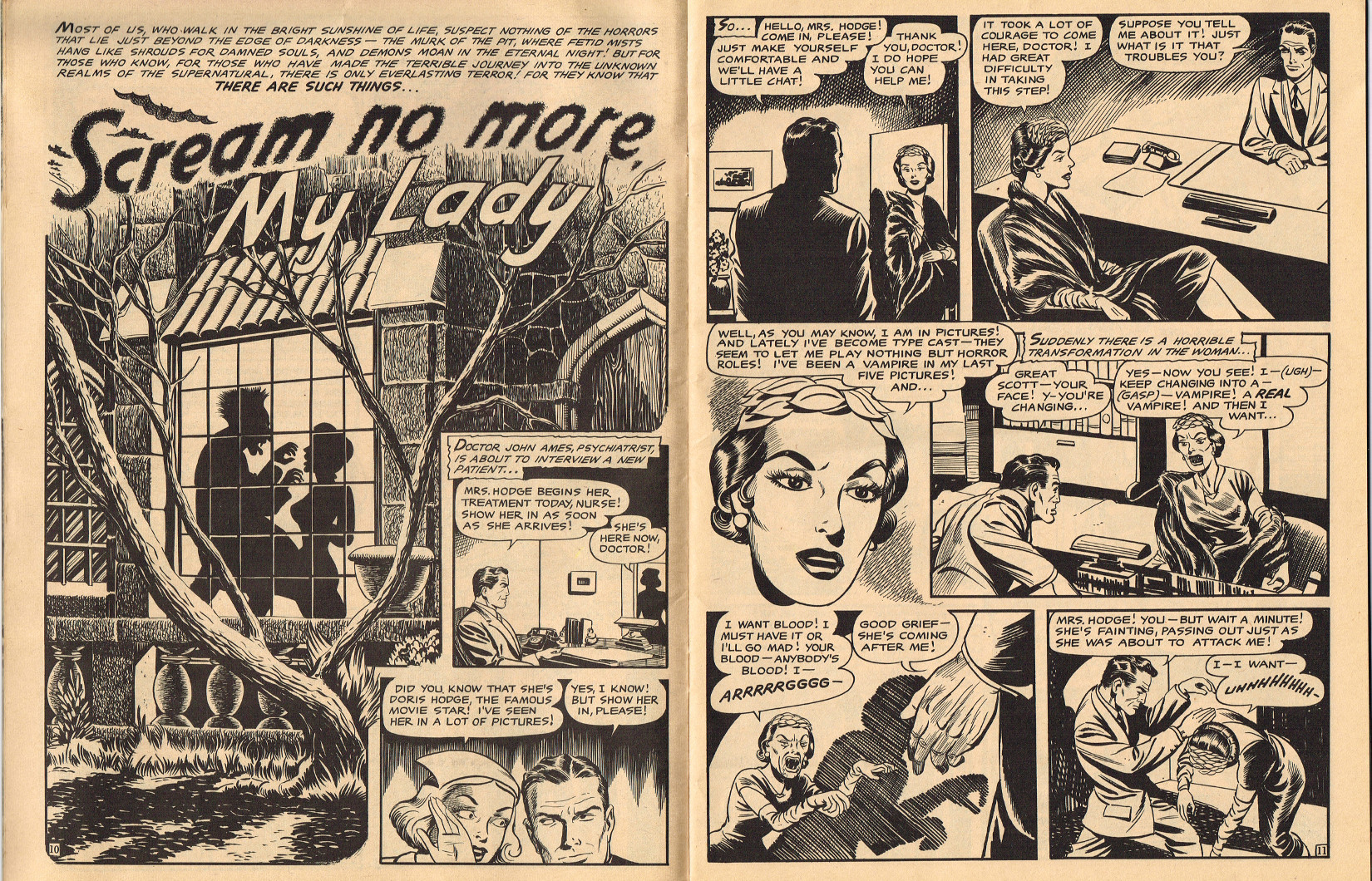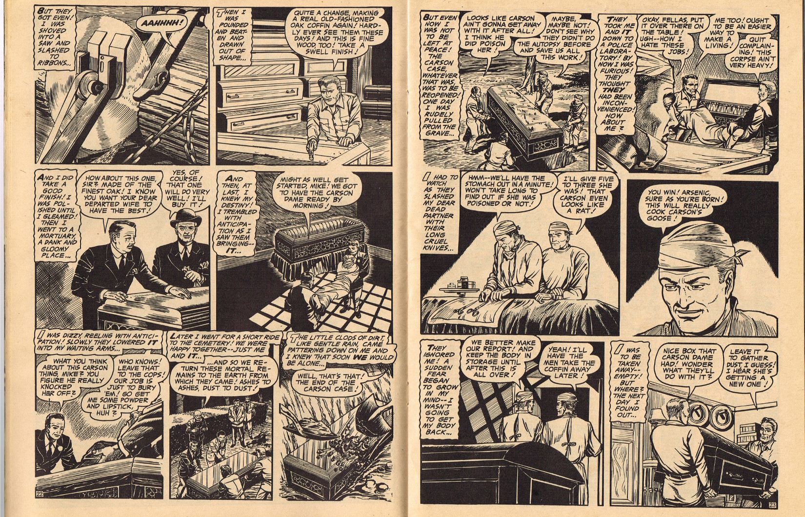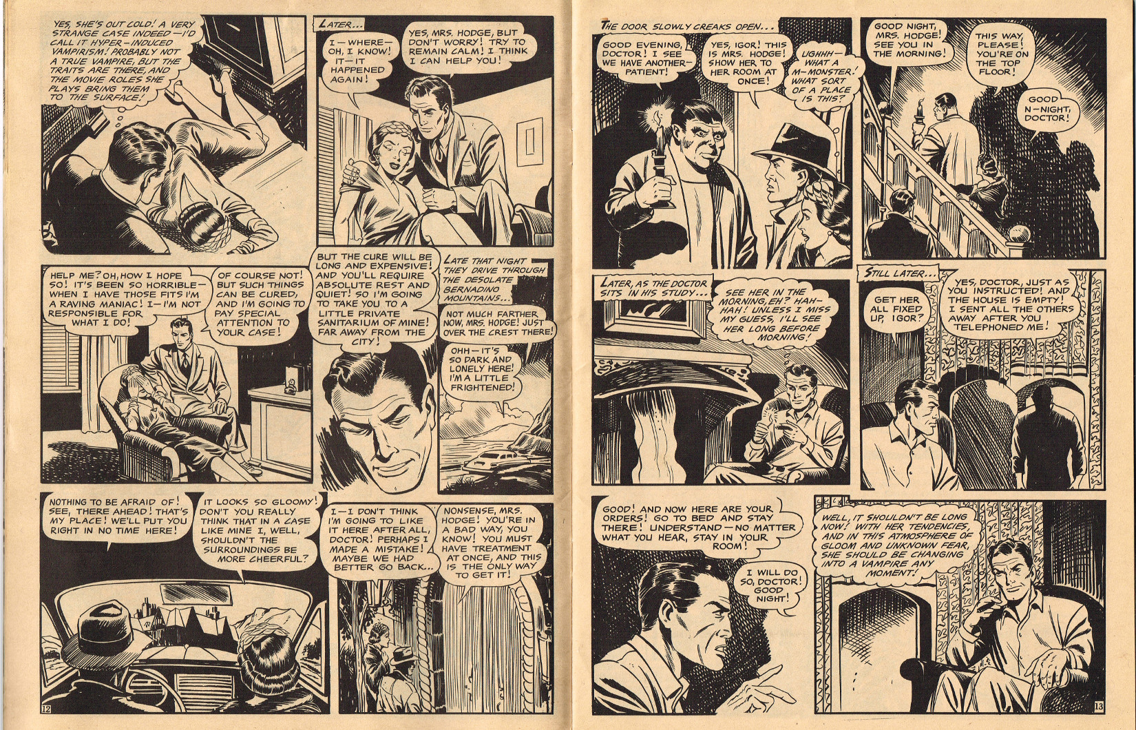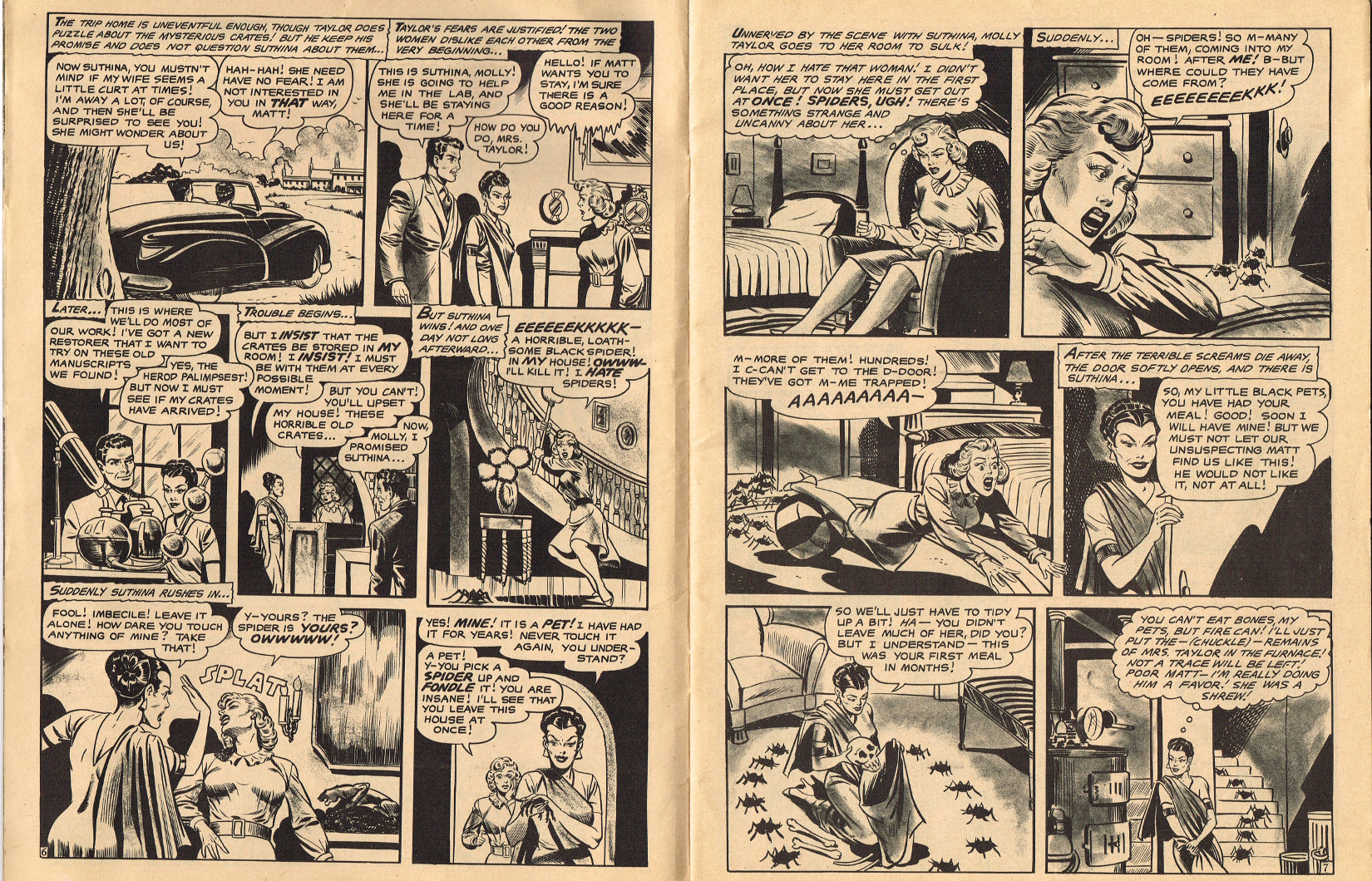 Gruesome metamorphoses abound in issue 11, 1966, of Weird magazine. And scrumptious illustration too (for the morbidly-minded, of course). Voracious spiders get their fill, vampires put the bite on, the rat king gets a nibble, and a coffin shares its thoughts. Boy, they really should ban this stuff. It will warp young minds for sure.
