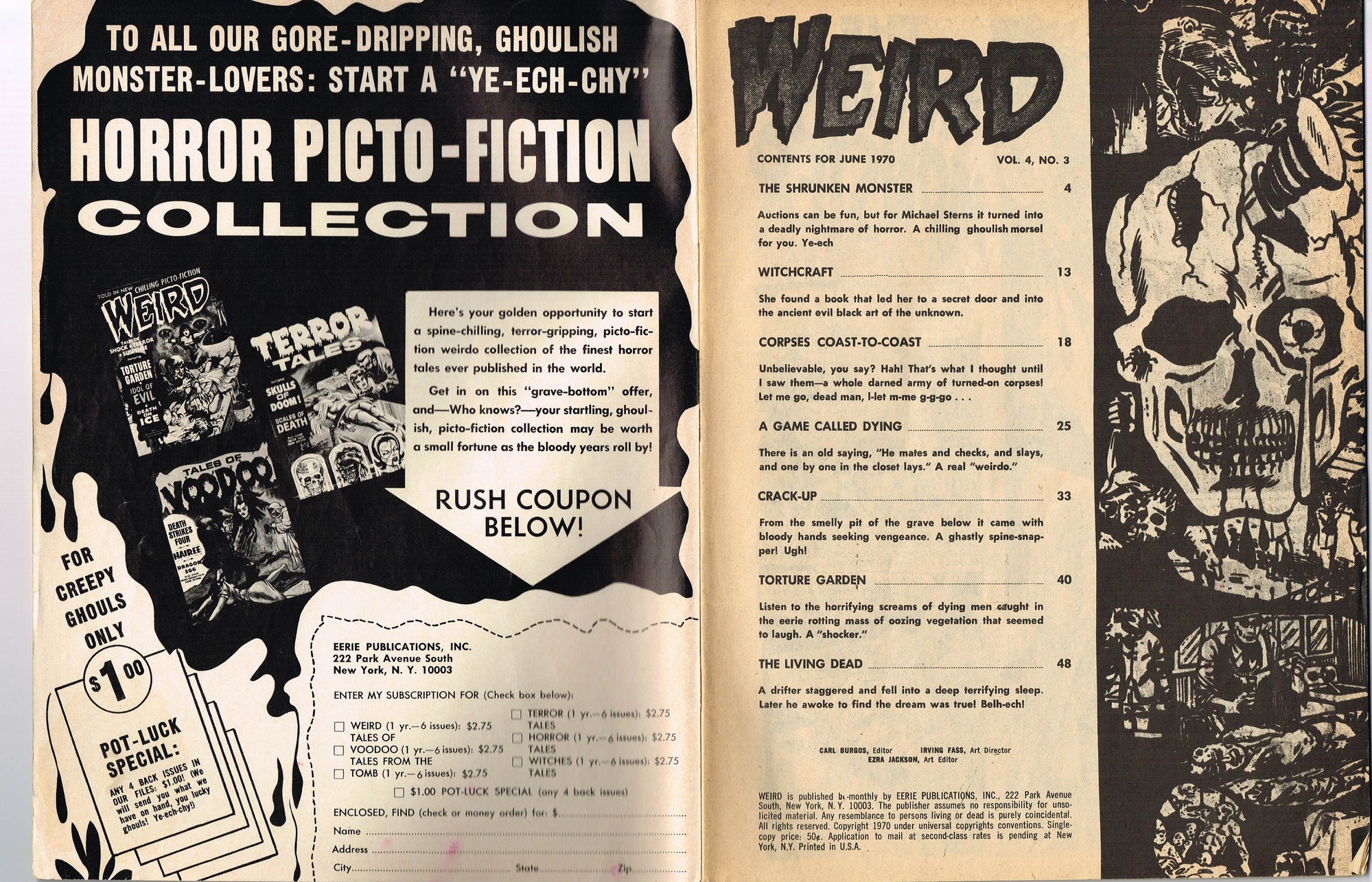 In this issue of Weird you'll find shrunken heads, floating hands, annoying corpses, wicked witches, and all of it nicely delivered in bloody black and white: a perfect treat for your Halloween swag bag.