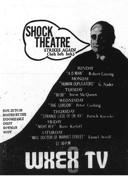 First of all, Bill Bowman’s character was genuinely unique. He put on the ghoul make up but never attempted to play the part. He had a remarkable comic timing and could play cornball next to double entendre seamlessly. It was a wild little ride where anything could happen that week. His enduring popularity as a pitchman, even two decades after his show left the air, says a lot about him.