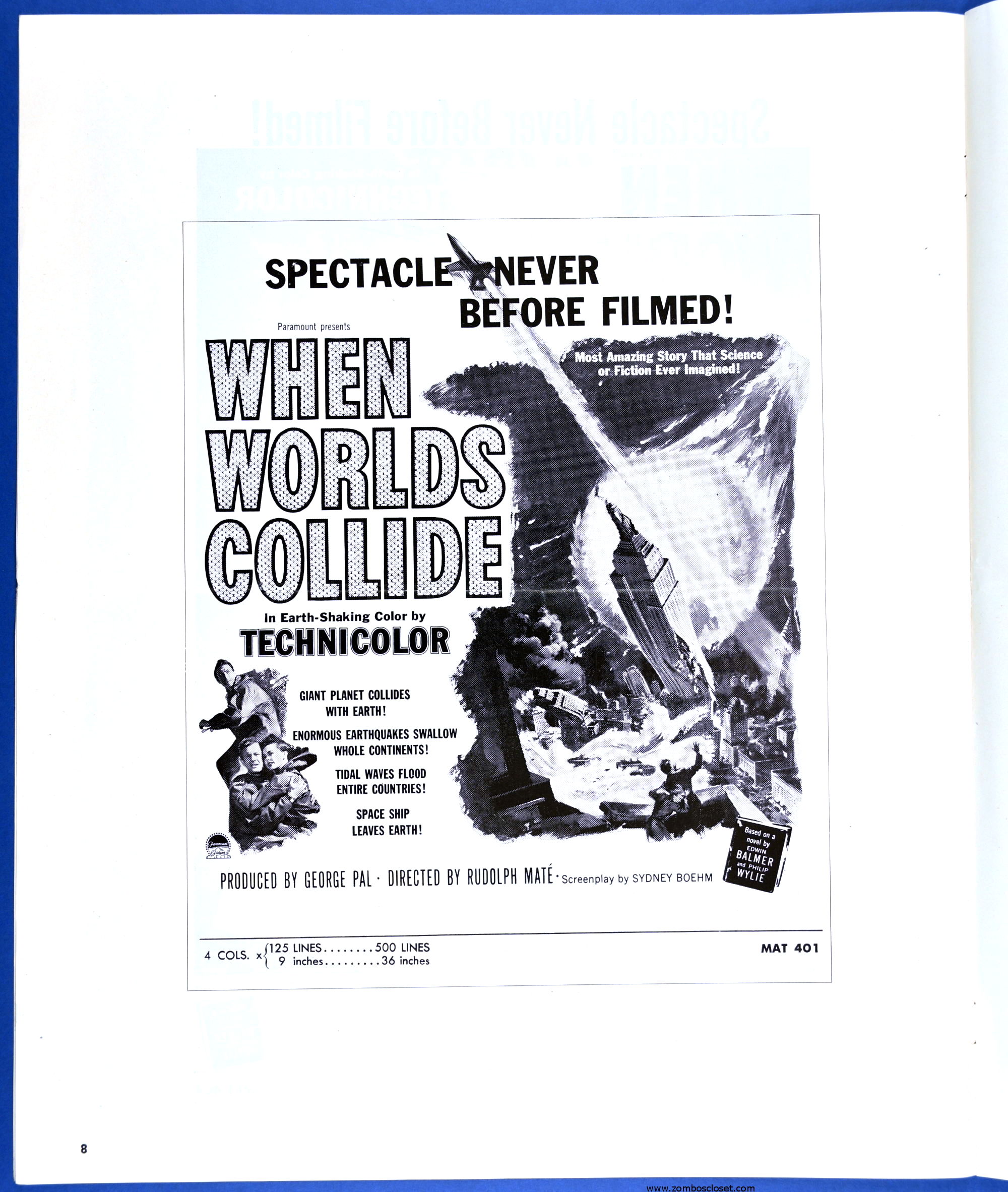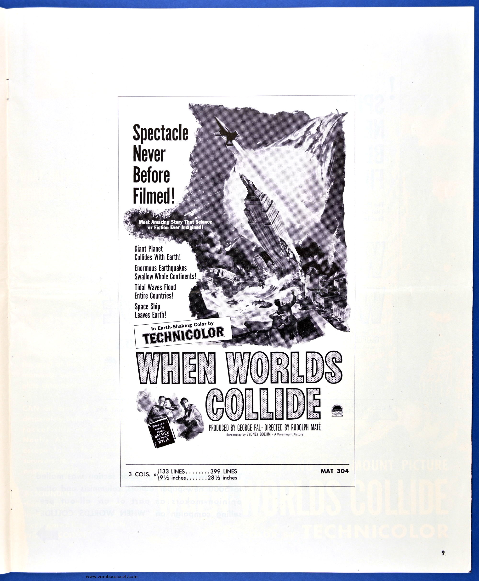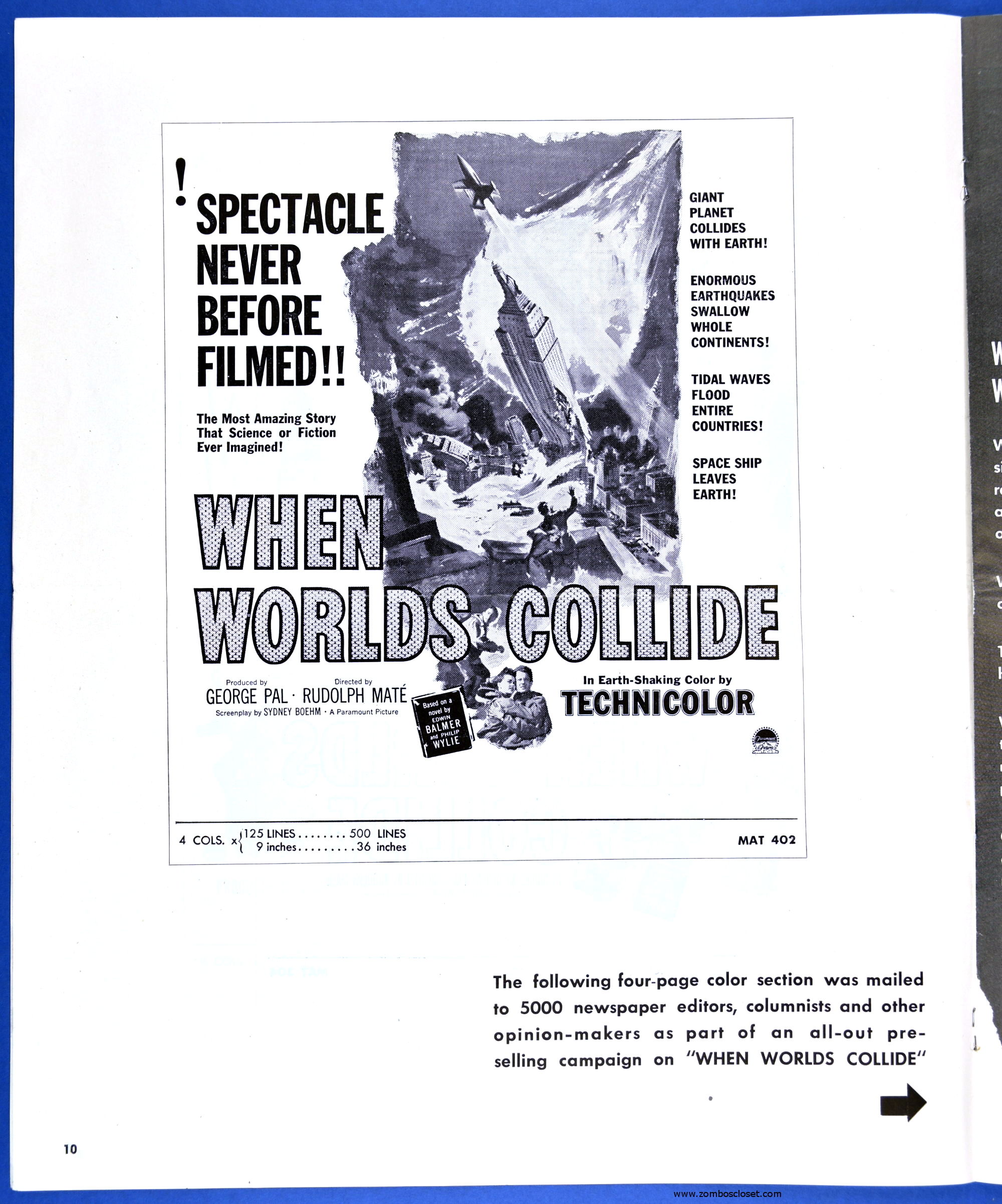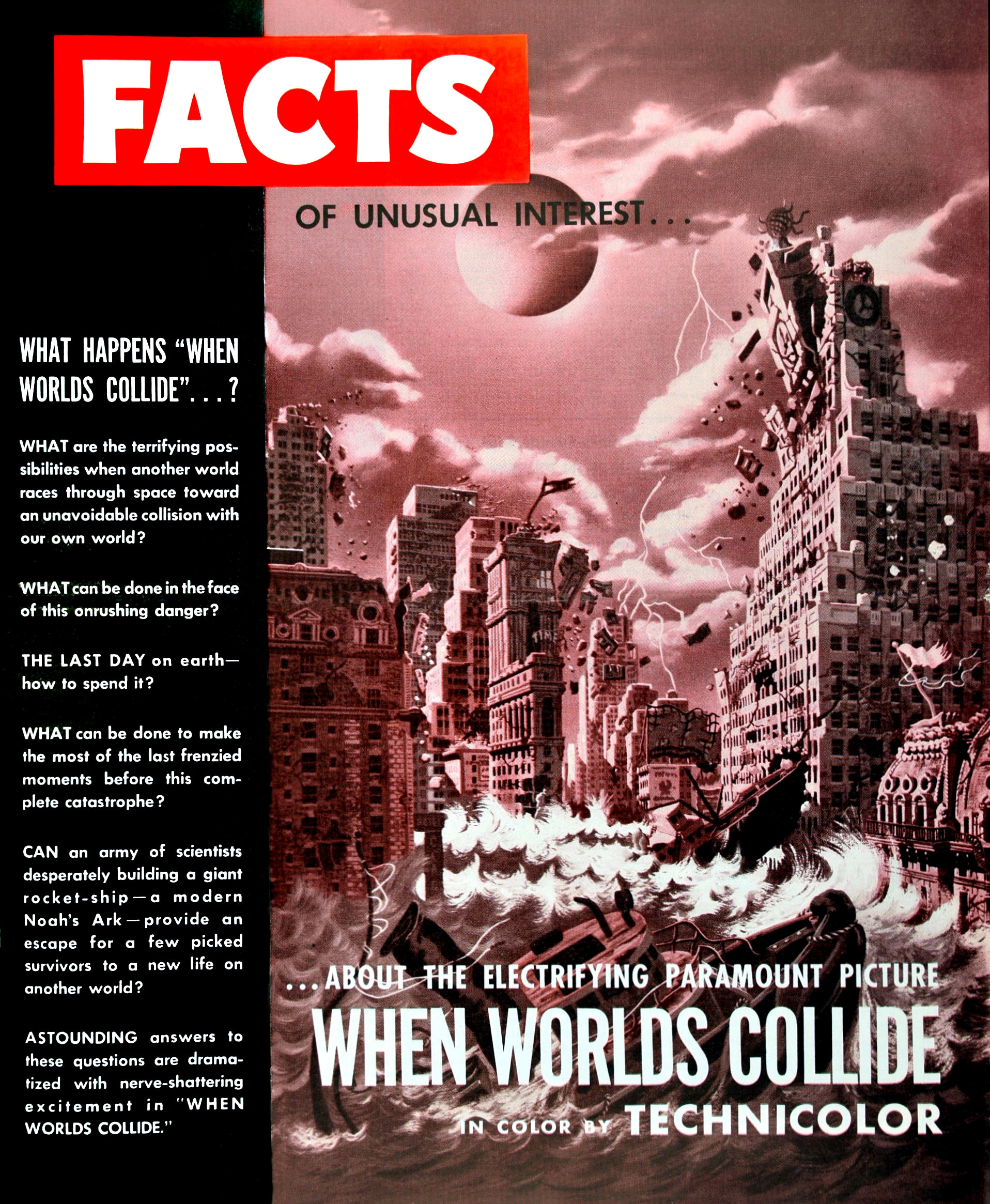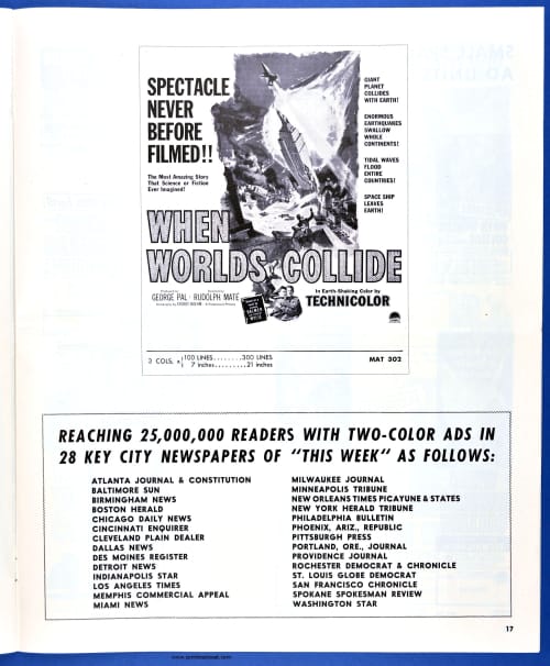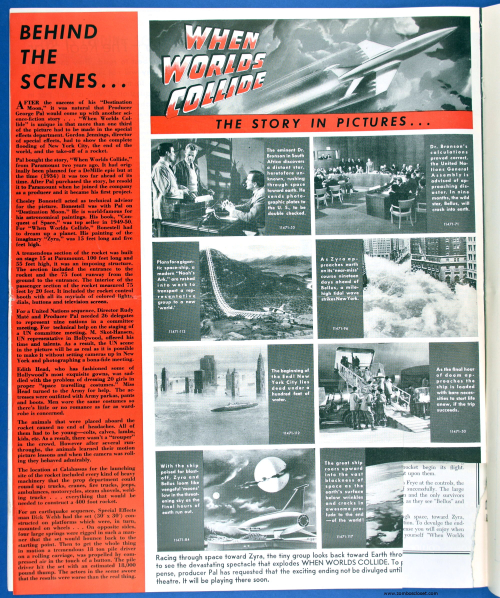 This planetary-sized pressbook for When Worlds Collide (1951) is by special request of ZC reader, pressbook nut, and George Pal fan, Terry Michitsch. His other request, the pressbook for War of the Worlds (1953), will land tomorrow. (And whoever the bozo who made the small clipping on the color page, a pox on you.)
