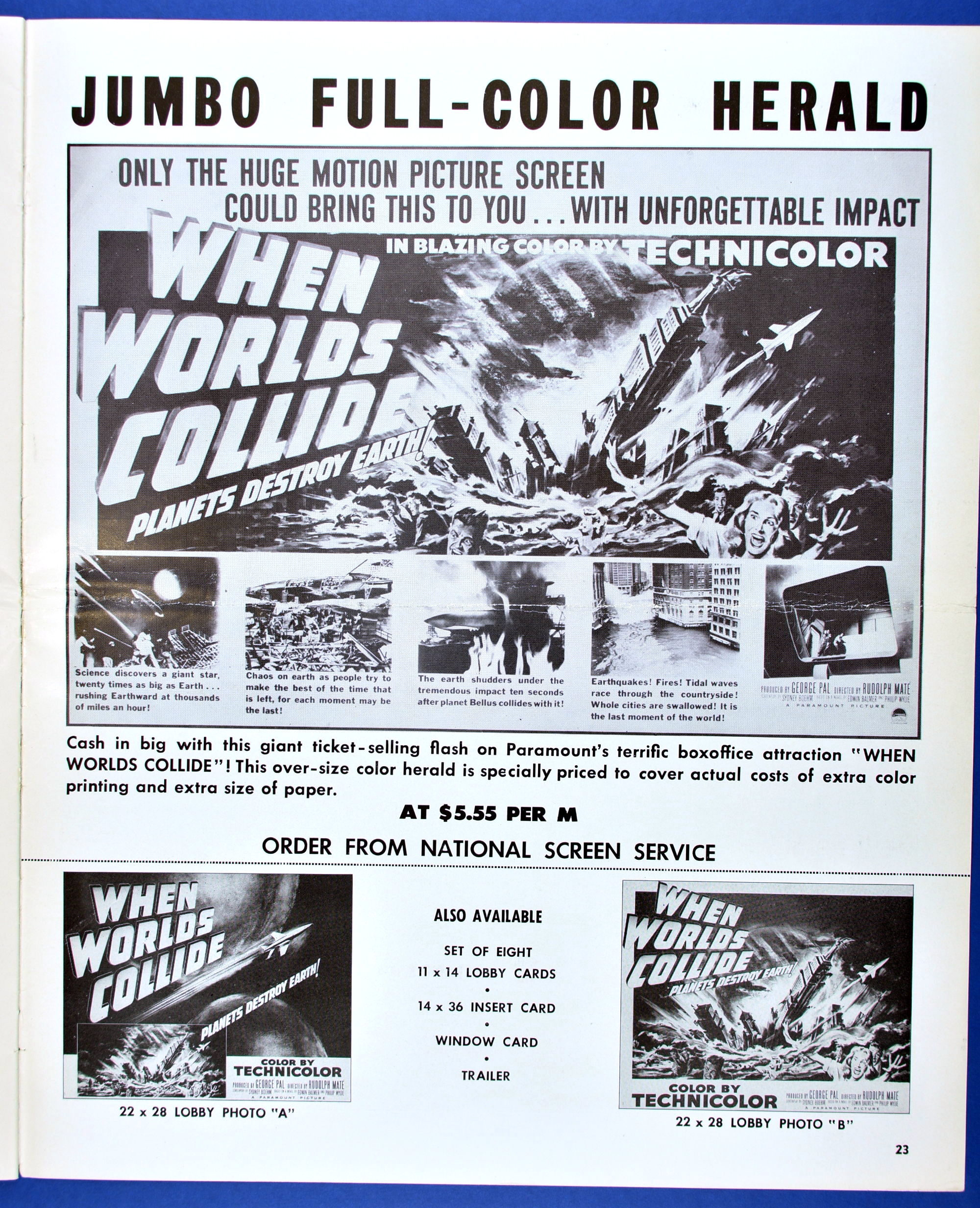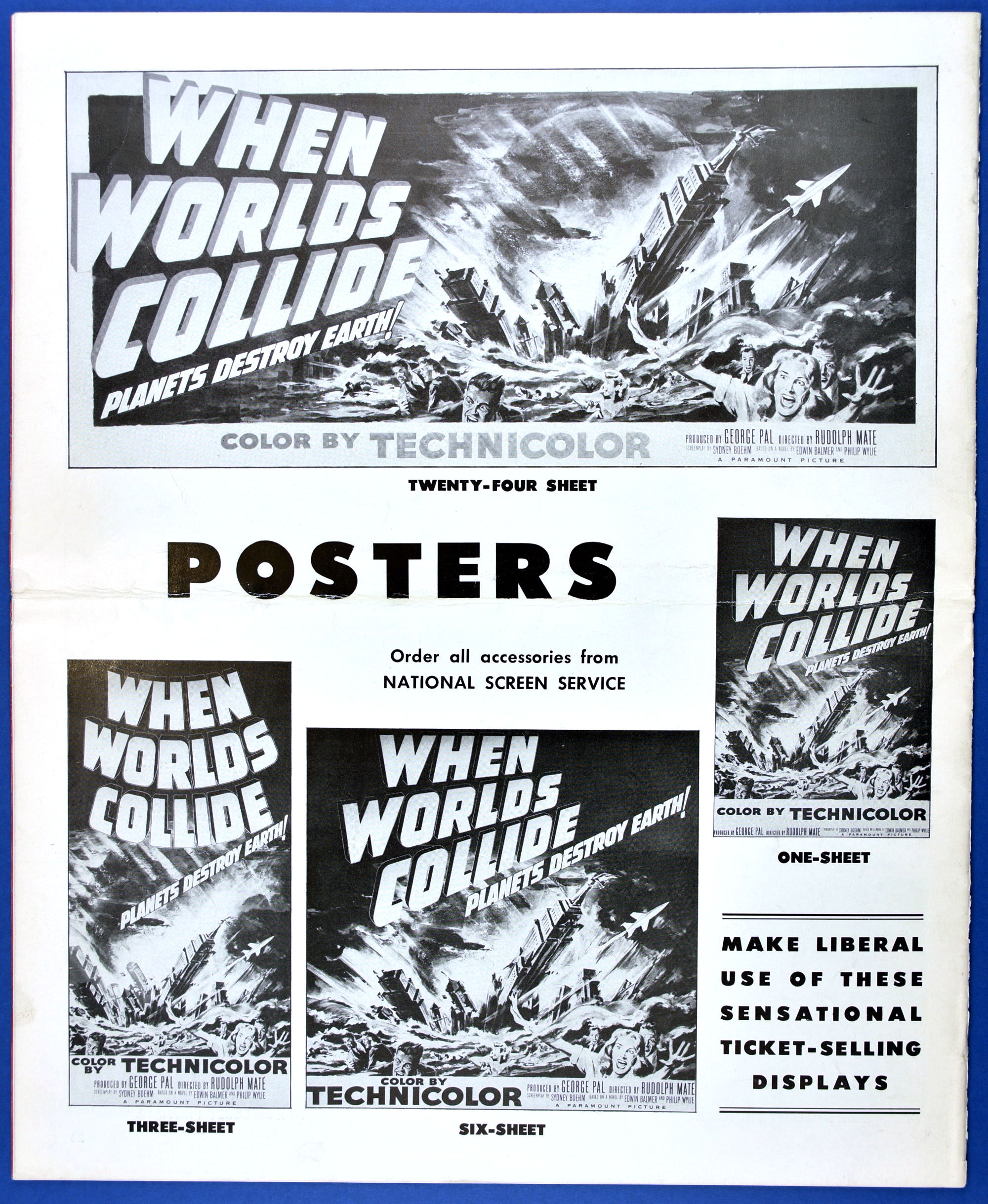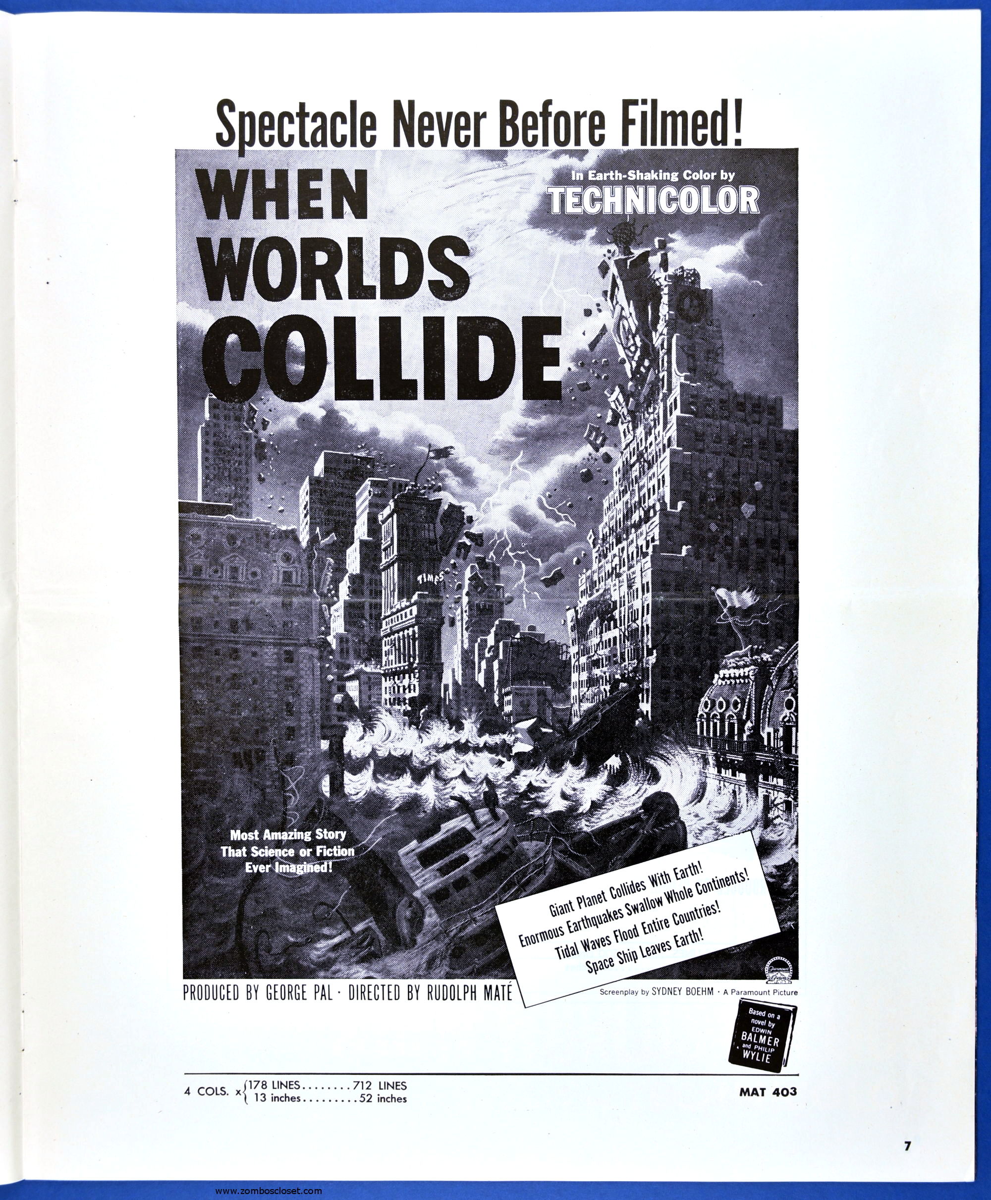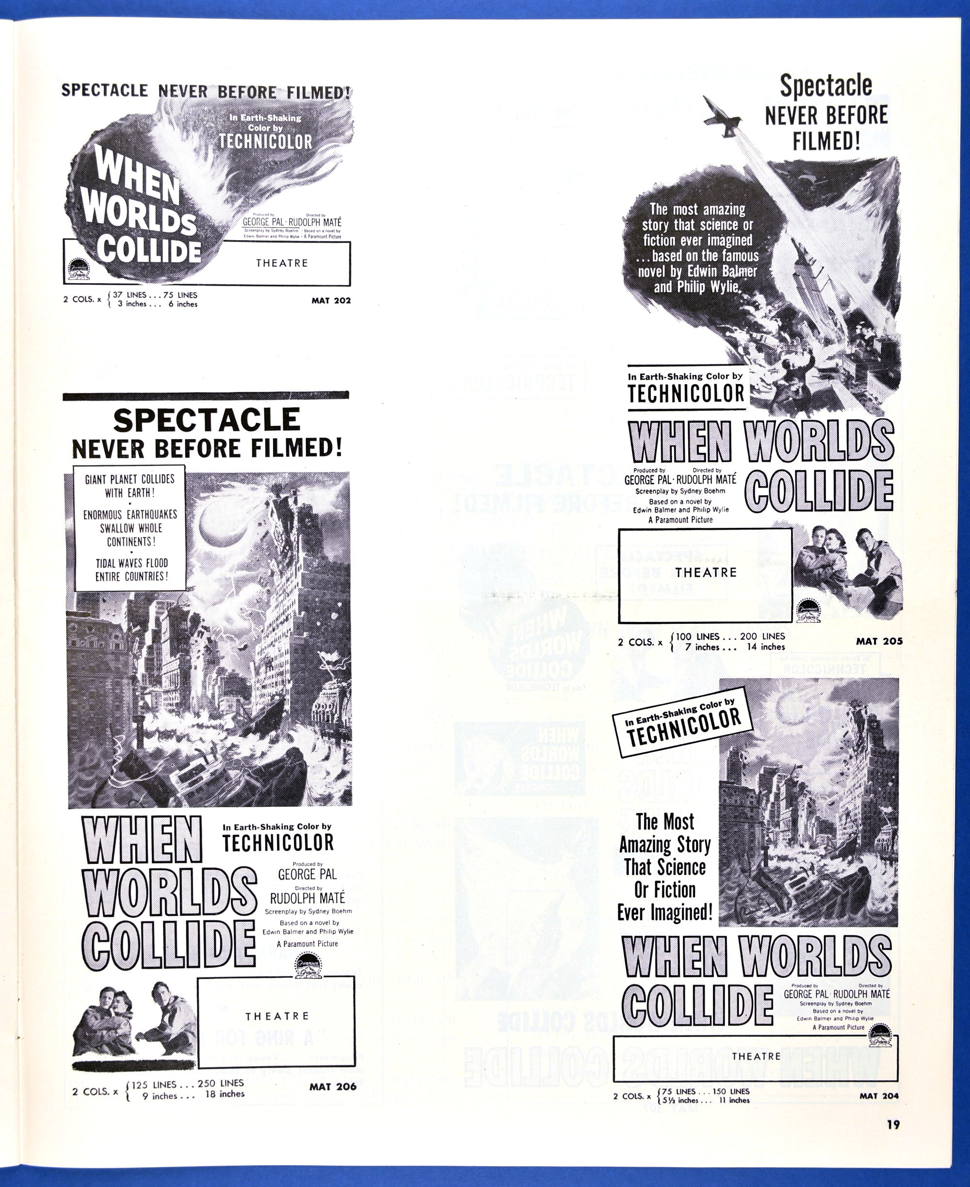 This planetary-sized pressbook for When Worlds Collide (1951) is by special request of ZC reader, pressbook nut, and George Pal fan, Terry Michitsch. His other request, the pressbook for War of the Worlds (1953), will land tomorrow. (And whoever the bozo who made the small clipping on the color page, a pox on you.)