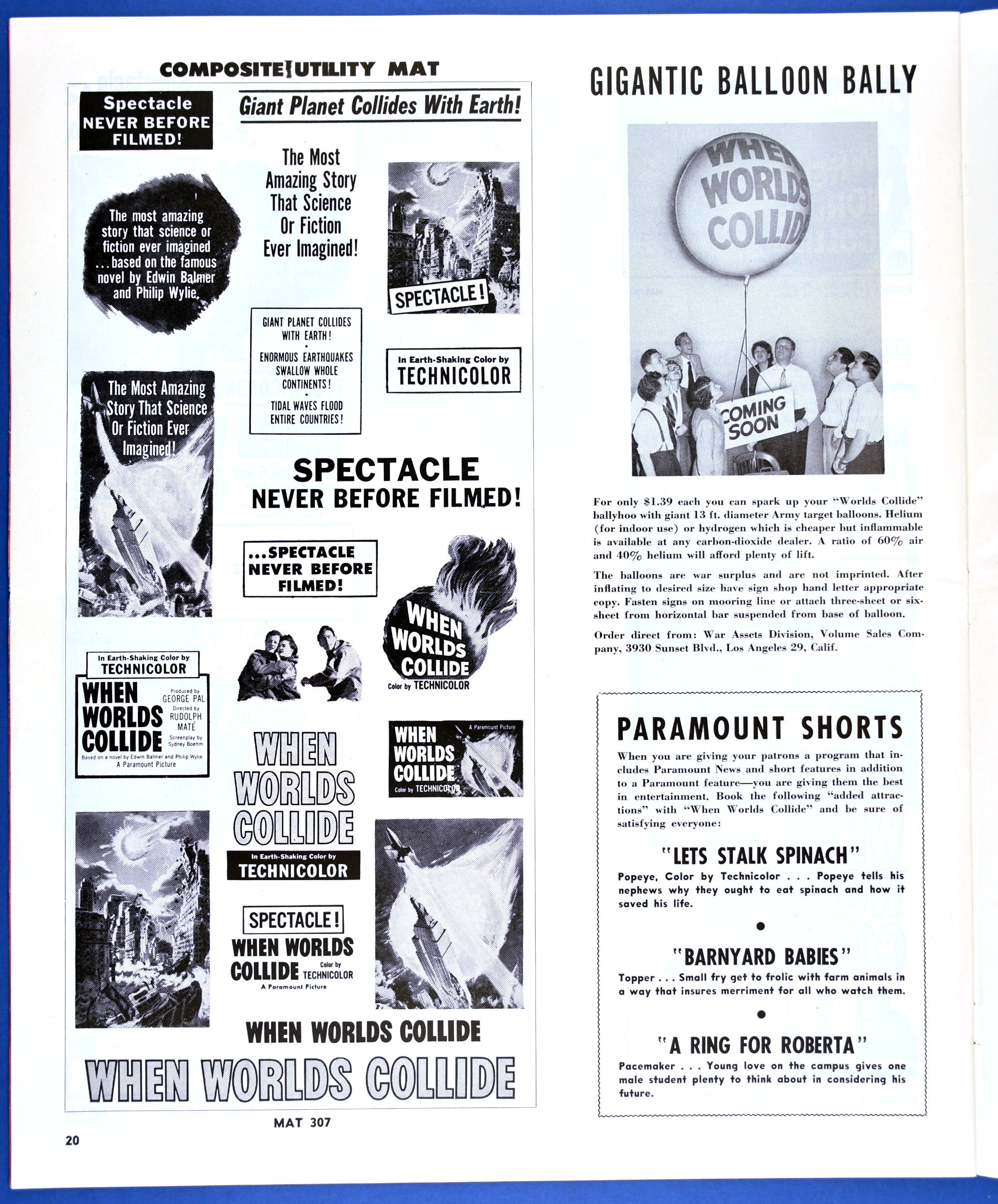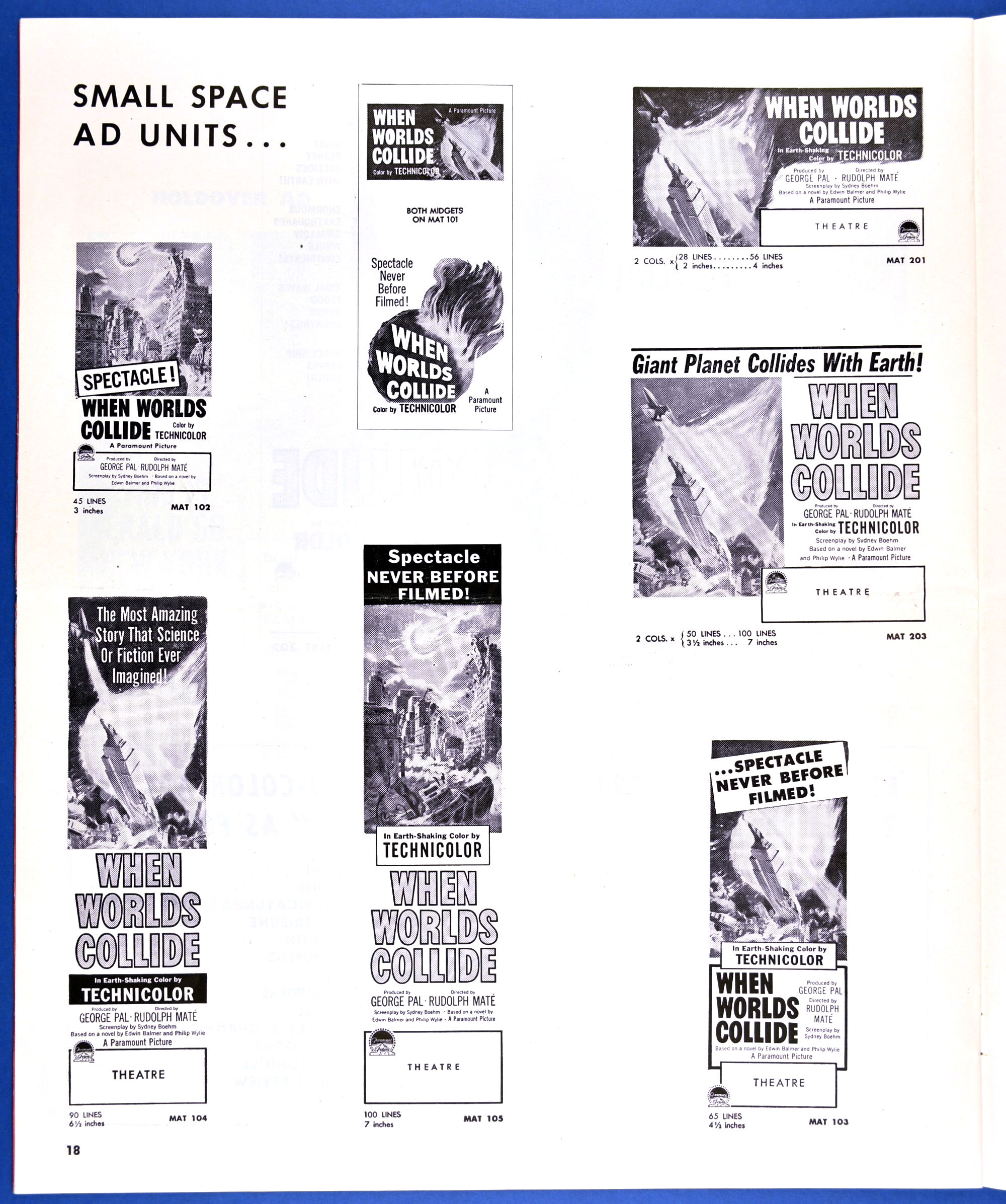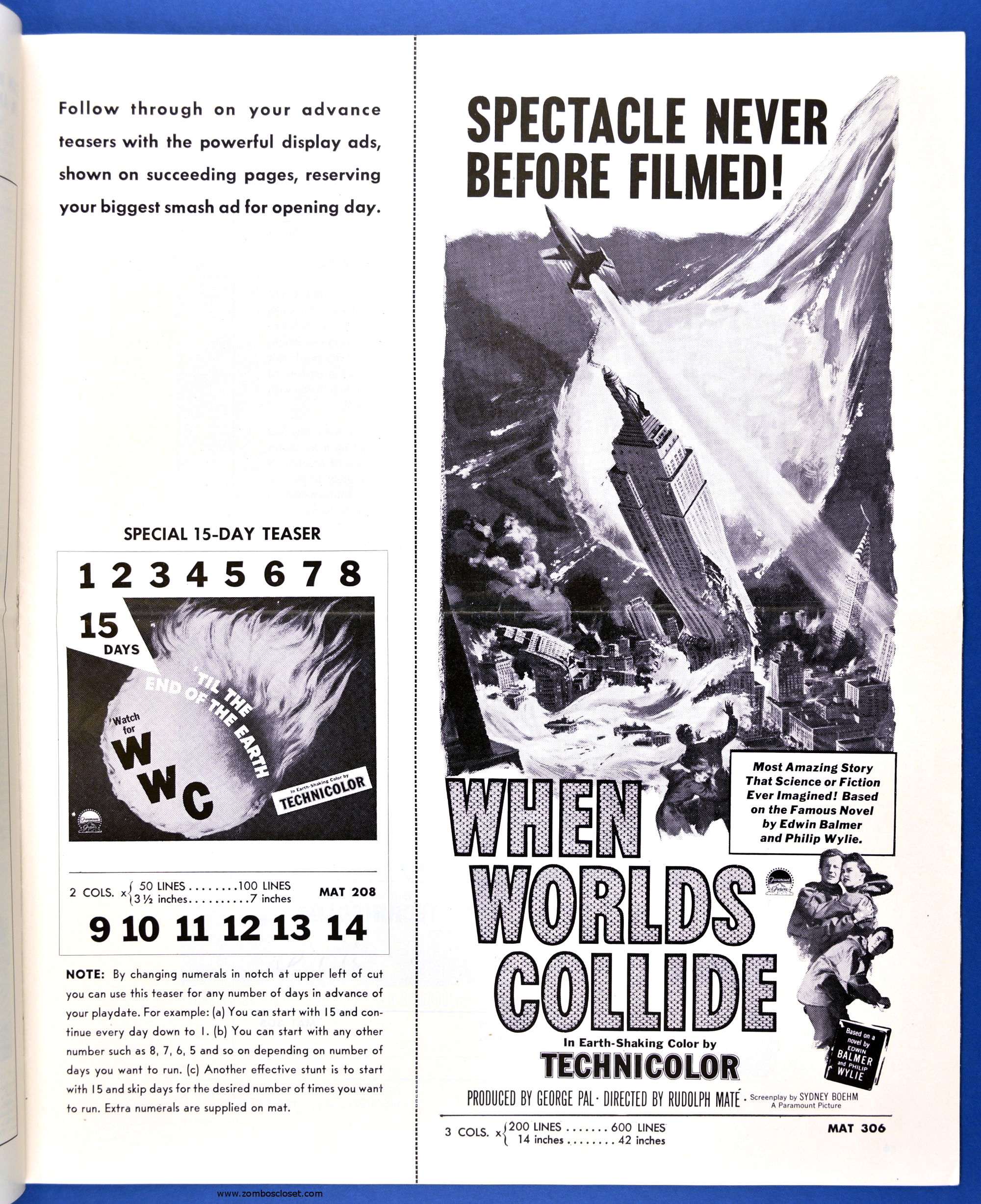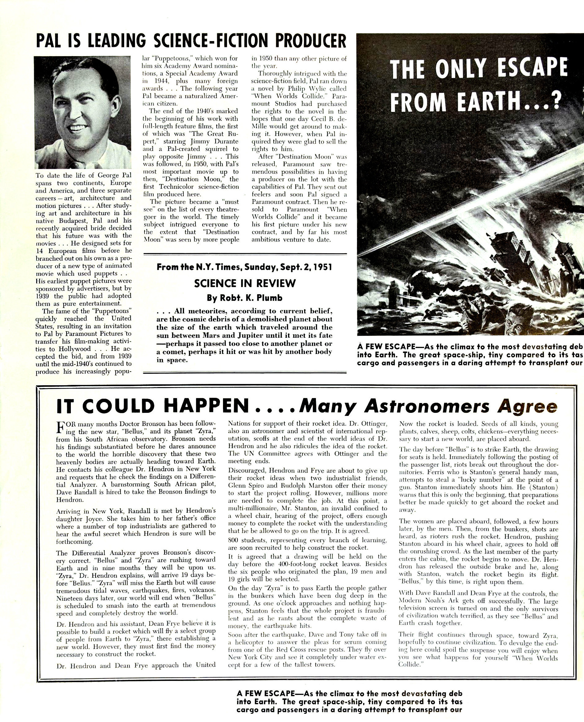 This planetary-sized pressbook for When Worlds Collide (1951) is by special request of ZC reader, pressbook nut, and George Pal fan, Terry Michitsch. His other request, the pressbook for War of the Worlds (1953), will land tomorrow. (And whoever the bozo who made the small clipping on the color page, a pox on you.)