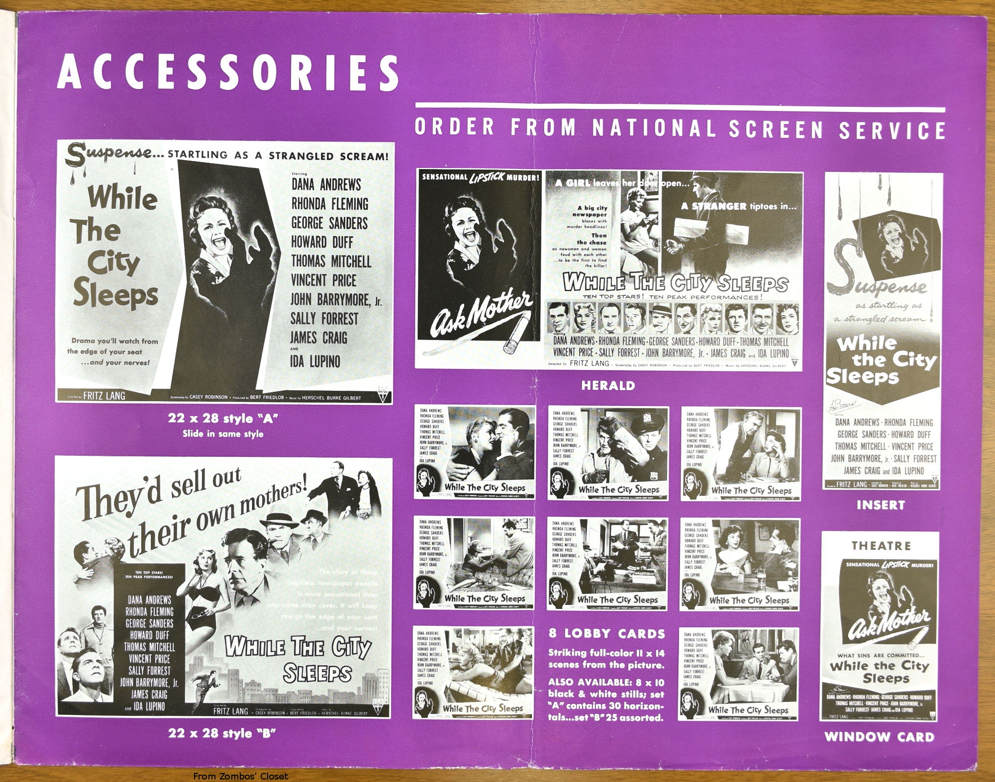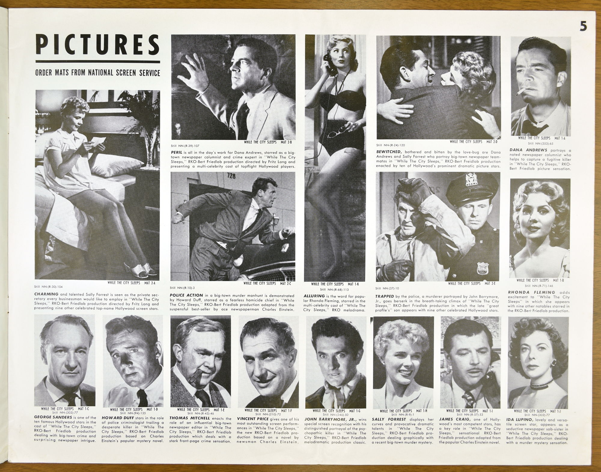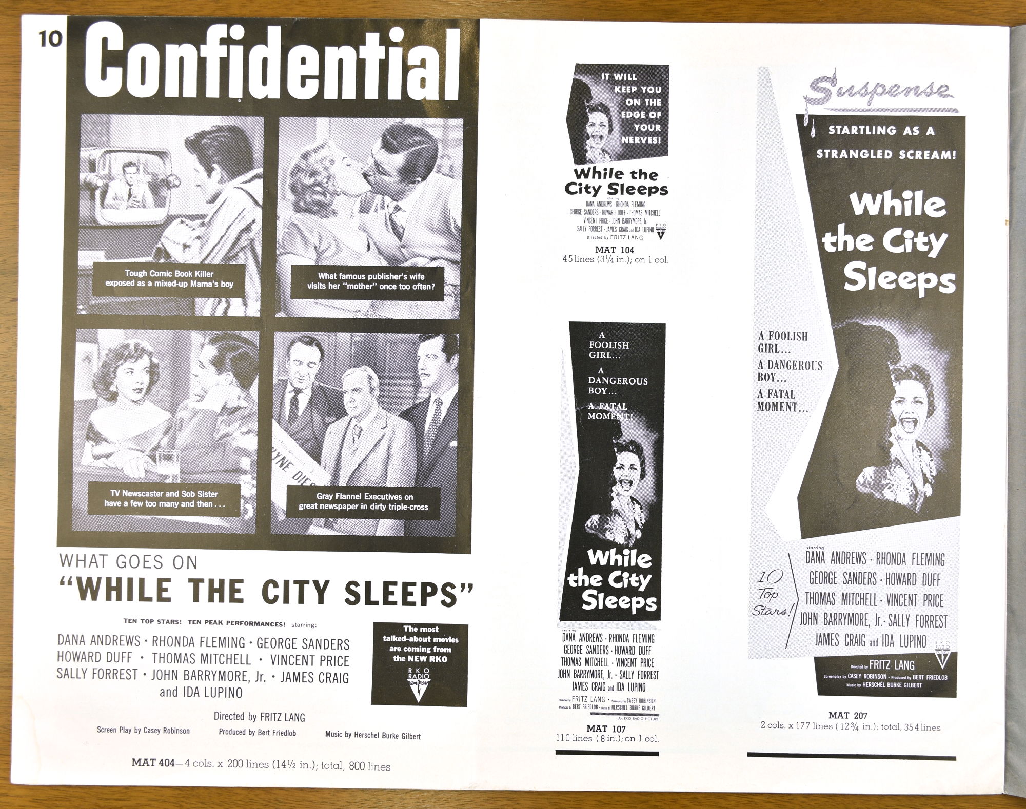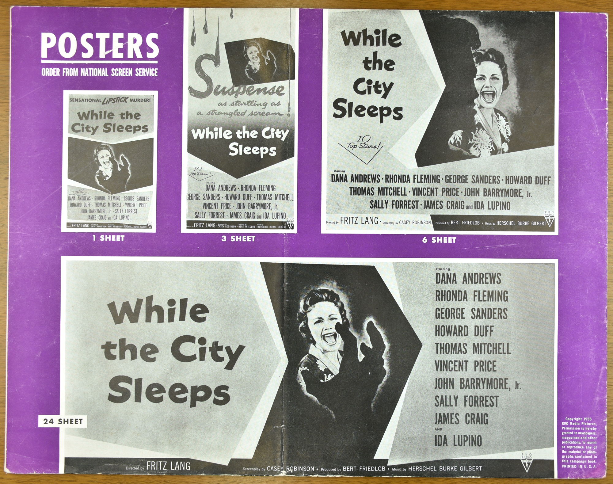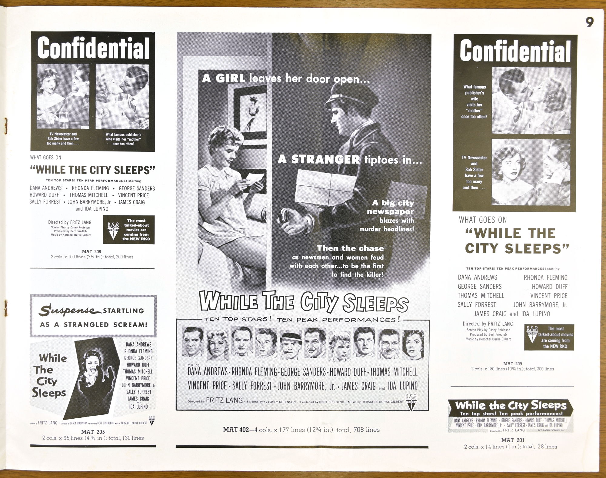 I've not watched Fritz Lang's While the City Sleeps yet, but the pressbook is a large format promotion, and tie-up bonanza, for it. The cast is quite impressive and the pressbook highlights that, too.