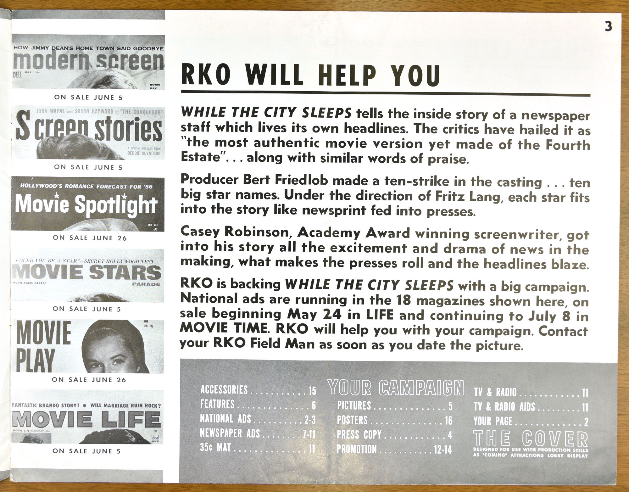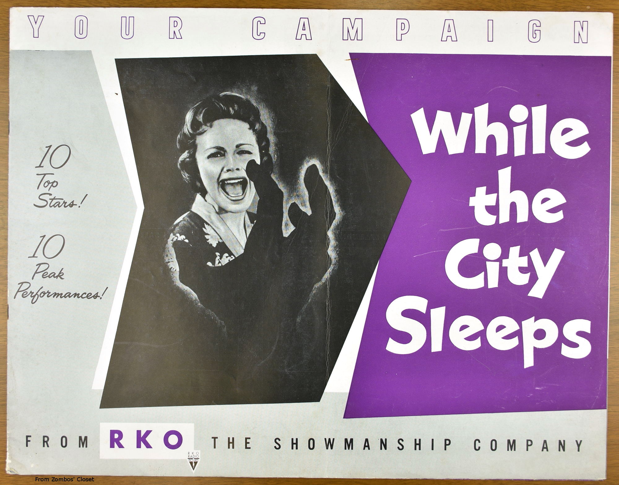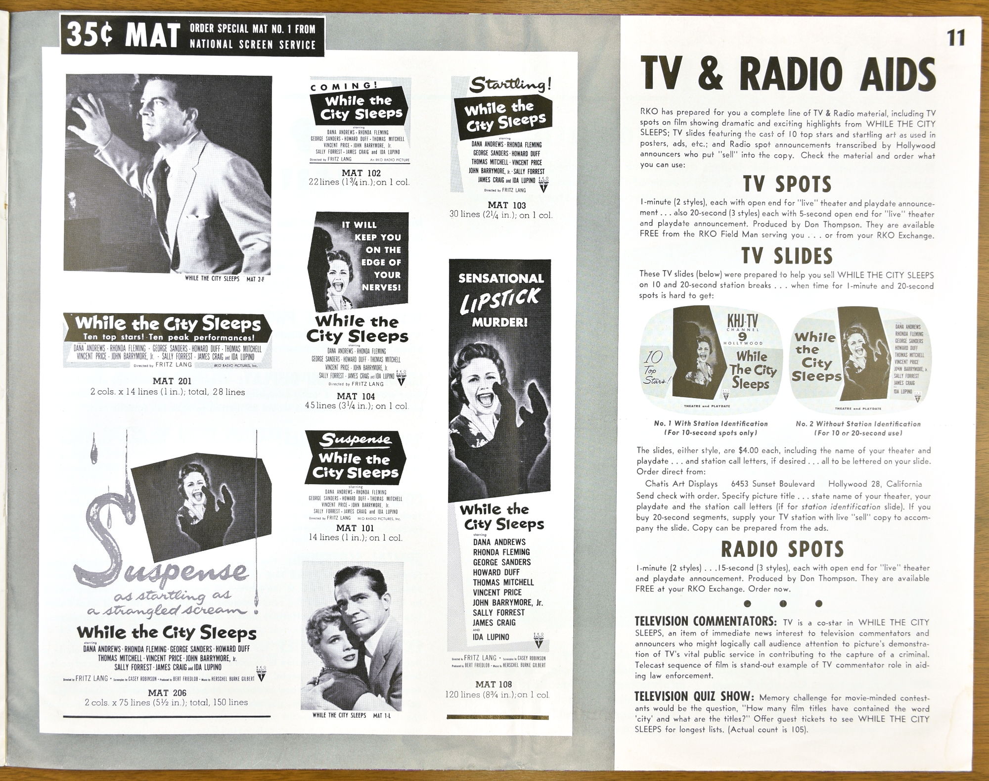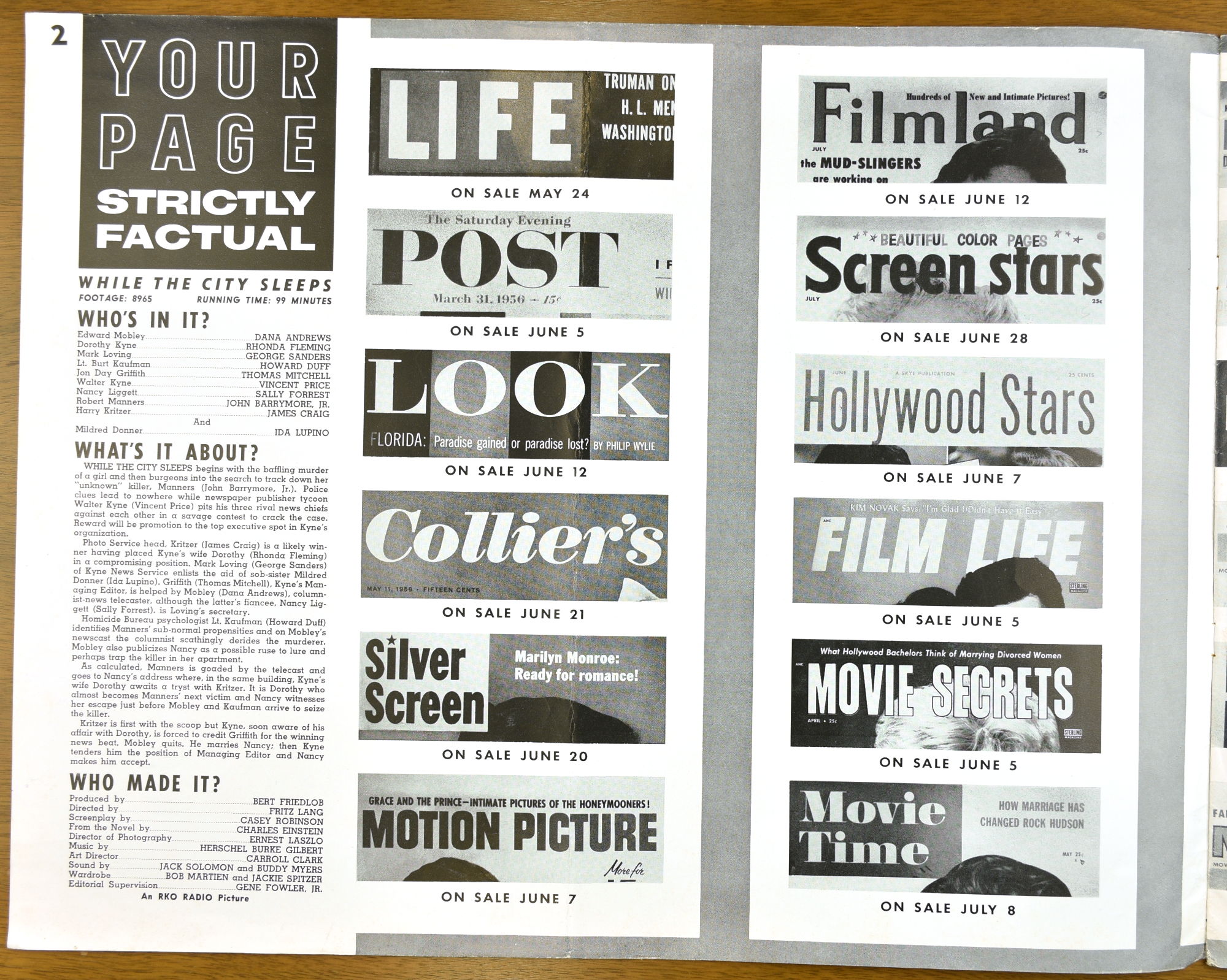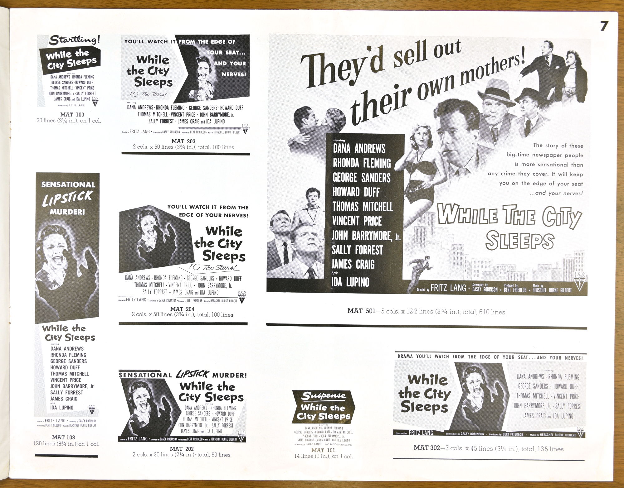 I've not watched Fritz Lang's While the City Sleeps yet, but the pressbook is a large format promotion, and tie-up bonanza, for it. The cast is quite impressive and the pressbook highlights that, too.