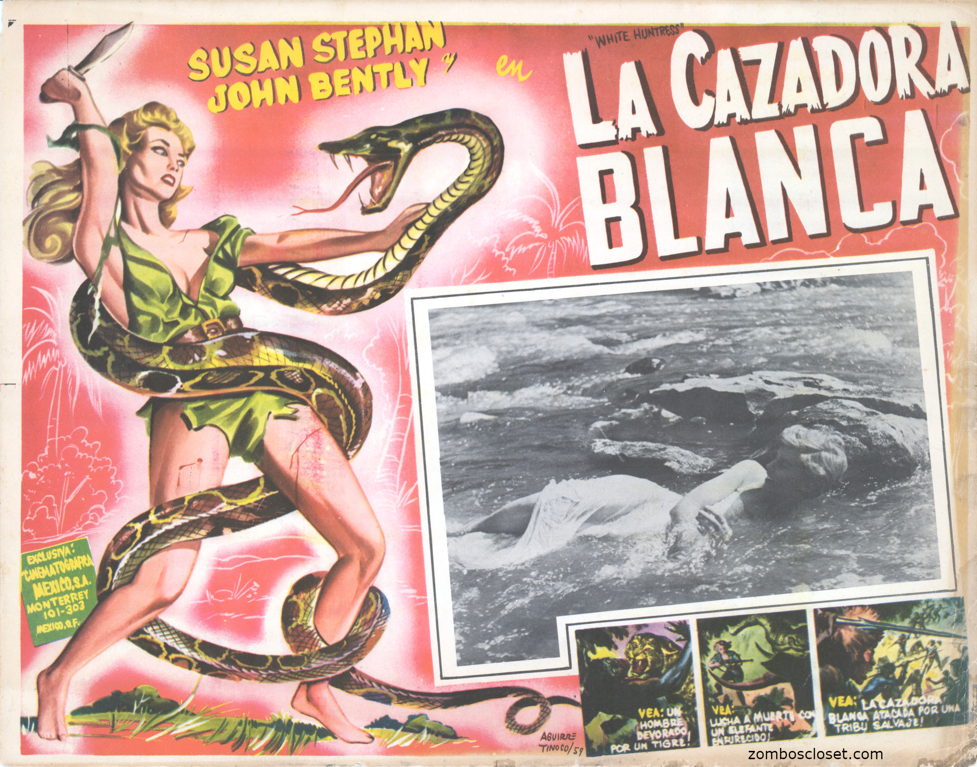 This Mexican lobby card for White Huntress pretty much follows the original poster art, but with more action and color. Who doesn't like watching blond-haired women fighting pythons?