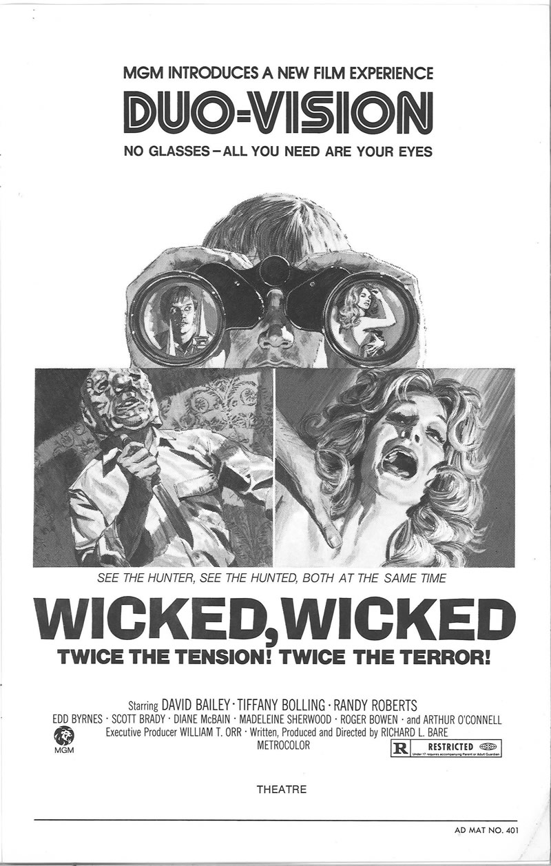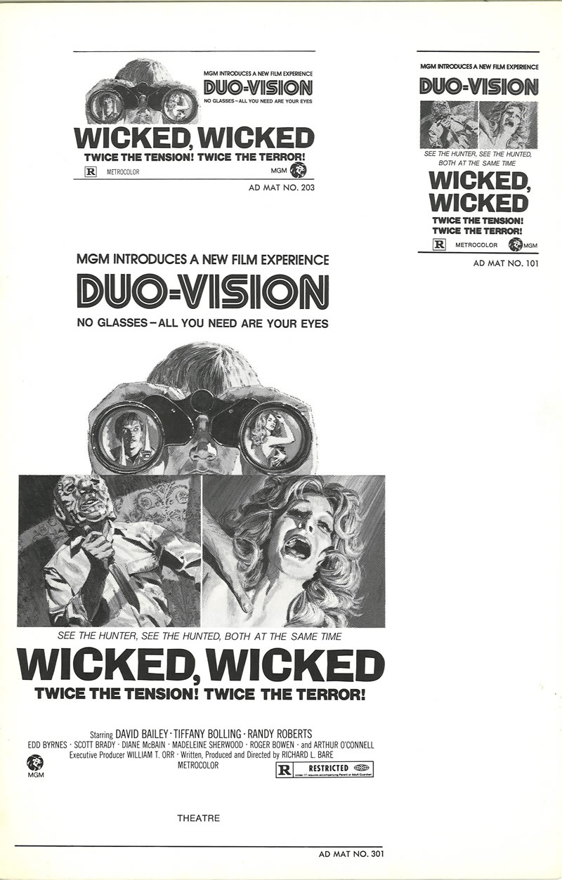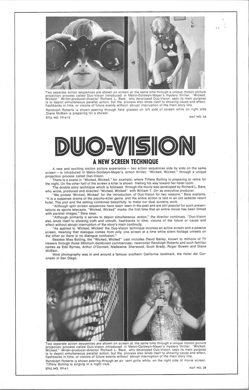 Wicked, Wicked (1973) Pressbook Leave a Comment / Pressbooks (Horror, Sci Fi, Fantasy) / By JM Cozzoli Move over silent era, step aside talkies, hit the road 3D. Now we have Duo-vision. Duo-Vision was by no means ground-breaking. It was just a promotional marketing term to describe split screen. Like this:Like Loading... Share this post Facebook Twitter Pinterest Linkedin