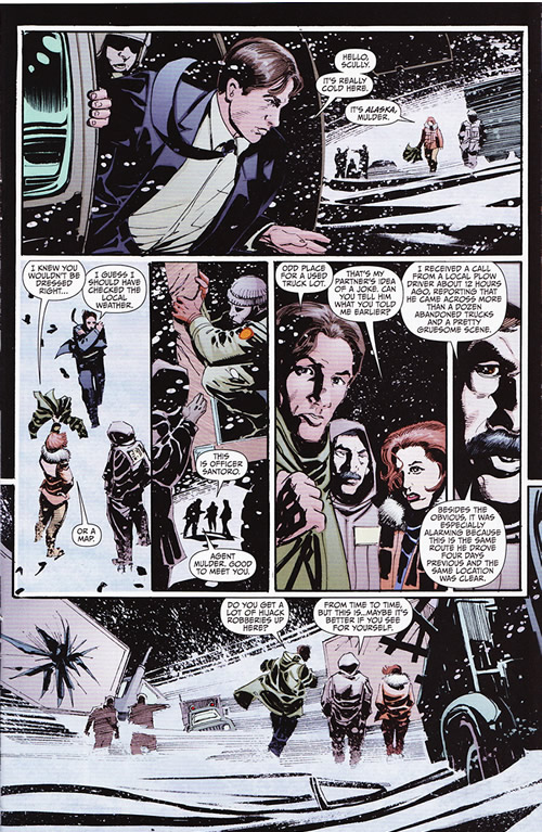 The art by Tom Mandrake serves up the snowy drifts with the fearful nocturnals to chilling effect, making this twenty-two page issue a pleasing mouthful of setup for what promises to be a gripping story even Chris Carter can sink his teeth into for the big screen. (Chris, you owe us one, big time.) The ending splash page is one of the best hooks I've seen for picking up