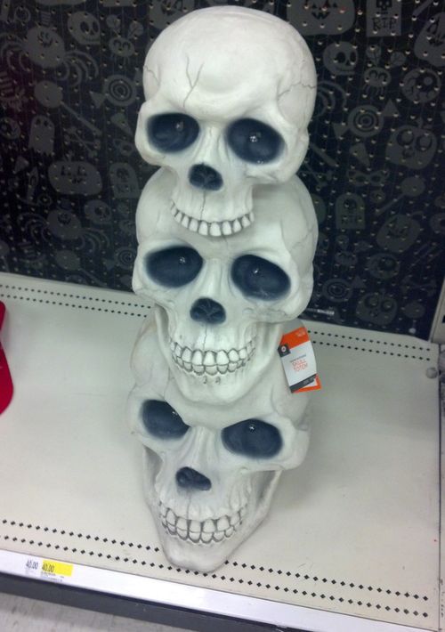 The past few years Target has focused more on party decorations than quirky-fun-quotient Halloween items, but whatever they put on the shelves it usually has style. Skeletons and skulls are always a staple too, and this year I'd say the Skull Totem is my favorite, followed by the Talk-back Skull. The light-up eyes owl also turns its head and hoots, which is attention getting, and the Day of the Dead decorations are nice accent pieces. The Haunted House in Dome has bats swirling around when you press the button. One thing to note: the Talk-back Skull is very presentable as a showpiece, but check the back of the plastic dome before you buy one. There's a screw that holds the skull to the dome and some domes were badly cracked around the screw.