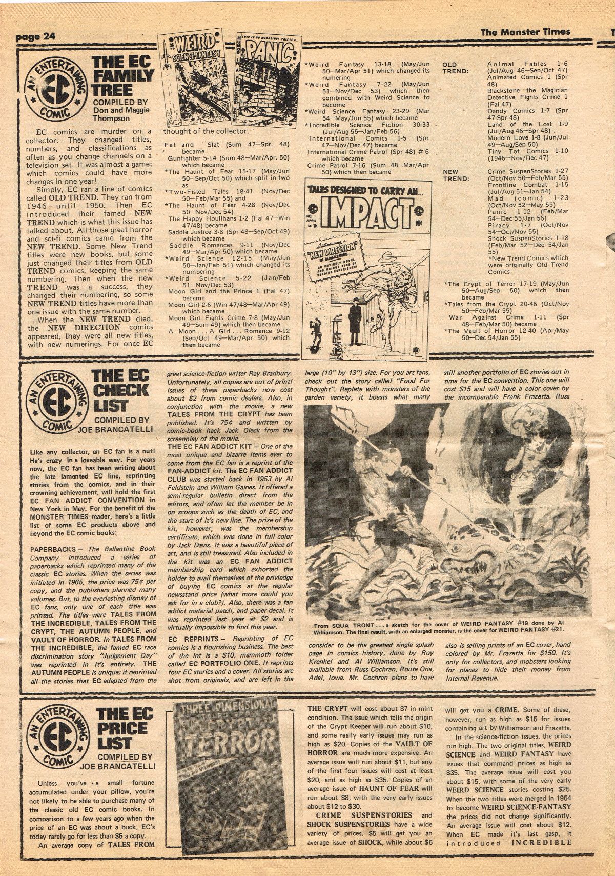 Issue 10 of The Monster Times, May 31, 1972, is devoted to EC Comics. So, of course, the Gruesome Threesome EC horror hosts are "interviewed" by Mark Evanier, Don Thompson scrutinizes the spawn of Dr. Wertham, and Bill Gaines and Al Feldstein reveal how the horror comics started. Fright Night's Horror Host, Seymour, puts in an appearance, too. (Read issue 10.)