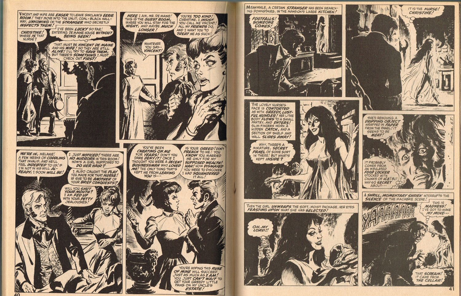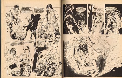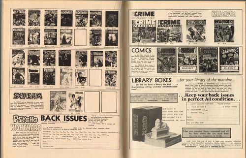 The cover art by Vincent Segrelles is fantastic, but doesn't seem to have much to do with this special all ghoul issue of Skywald's Psycho, issue 15. The stories are ghoulish enough, though. My favorite is The 13 Dead Things. The editor, Al Hewetson, is quoted as saying the glut of Marvel black and white magazines forced Skywald off the newsstands, otherwise their horror-mood brand of illustrated terror was selling well. (I came across this complete checklist of Skywald magazines on the Wayback Machine website. I converted the information to PDF, so you can Download Complete-Skywald-Checklist.)