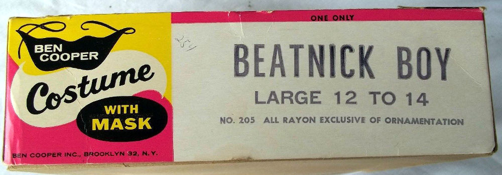 Good thing this Beatnik costume, Beatnick Boy, from Ben Cooper is flame retardant; you never know what those beatniks are smoking. Just practice snapping your fingers together with an air of aloofness, and have a short beat poem ready to amuse the candy givers. (For those of you old enough to know what I'm talking about, for the life of me, the mask keeps reminding me of Paul Winchell!) Oddly enough, this is the first mask I've seen that fits comfortably in the box--like, just hanging out man--you know what I mean?