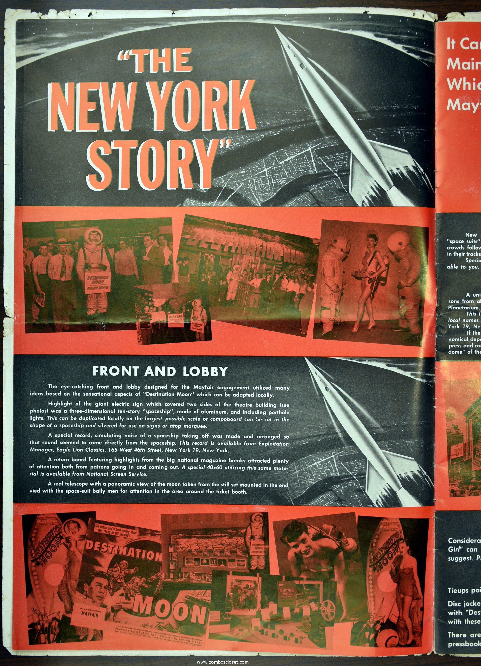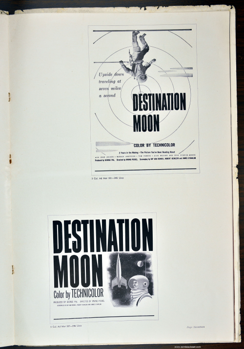 The Destination Moon pressbook is big. At 13.5 by 20.25 inches, and 31 pages, it is an impressive promotional campaign for the movie. It is interesting to note that this movie presaged the notion of private enterprise spearheading space exploration, not the government. Of course, NASA did the heavy lifting in the beginning, but now it seems private enterprise is taking the lead (for better or worse). Woody Woodpecker has the honor of explaining the scientific principles behind space travel. For the story behind that, see Wikipedia's entry on Destination Moon.
