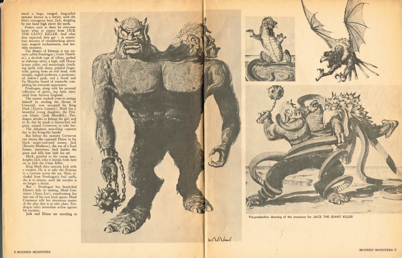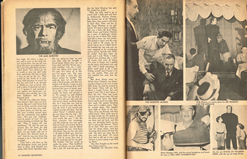 A very good monster magazine for the 1960s, Modern Monsters was more adult with its coverage of horror. In this issue 4, Glenn Strange provides interesting behind-the-scenes tidbits from his horror jaunts, Miniatures-Kill or Cure? is pondered by Bob Villard, and Victor Morrison shows us The Invisible Man and His Friends, or something like that. There's a full color centerfold to pin up, and King Kong and Spy Smasher are examined. At over 80 pages, with pictures galore, and layout that's plain but easy-reading, it's a shame Modern Monsters didn't continue past four issues. (Go to part 2)