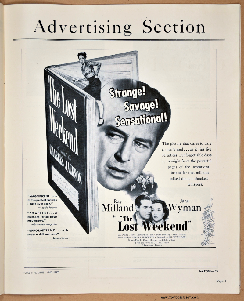 At 32 pages, this 12.25 x 15 inches pressbook for The Lost Weekend, directed by Billy Wilder, is quite a promotional statement. This is one of the first movies to use the theremin, which would become a notable musical accompaniment to science fiction movies of the 1950s. Wikipedia notes the movie toned out the homosexual overtones in the book.