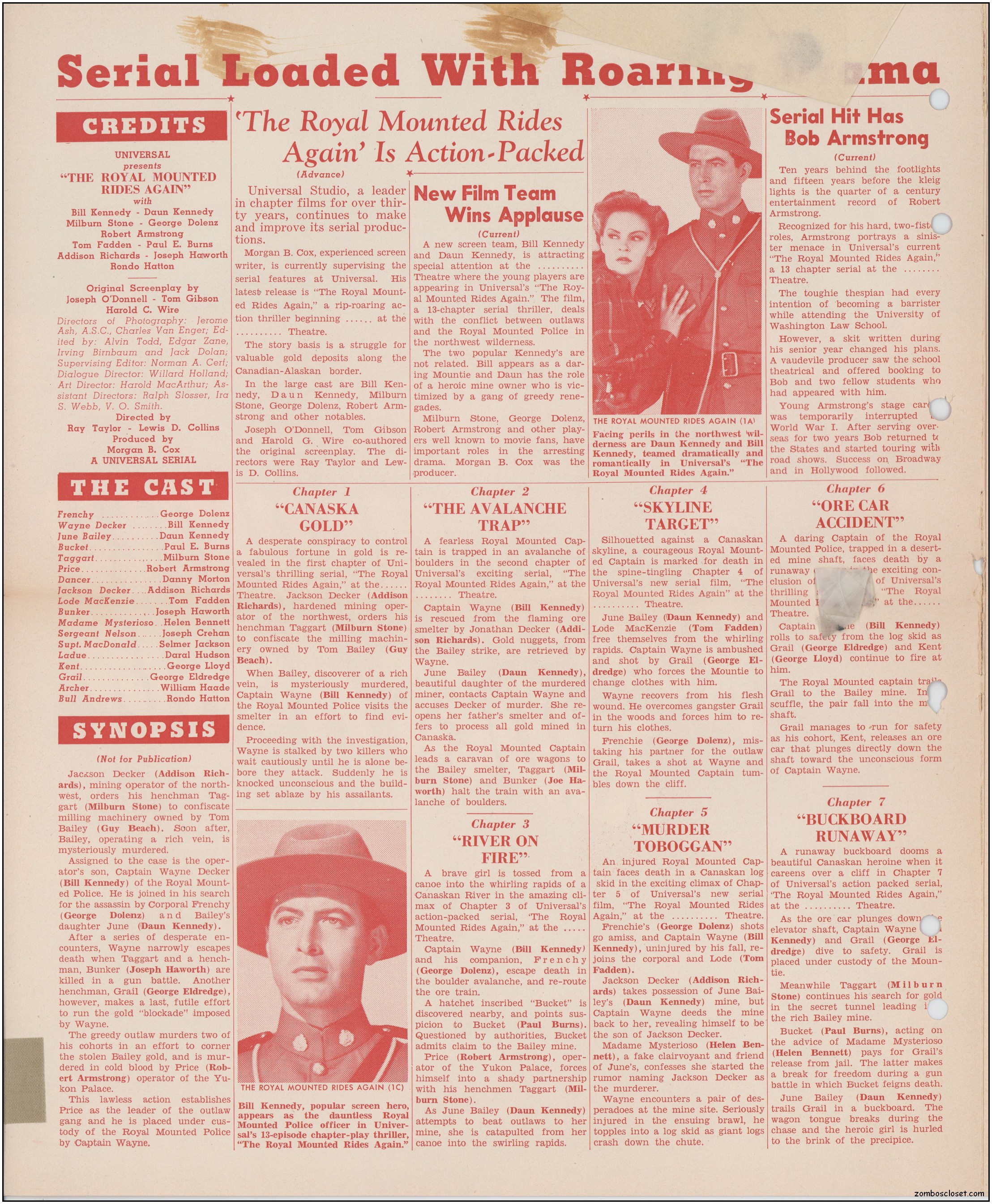Courtesy of Joe Dante and Charlie Largent (Trailers From Hell) comes this file copy for The Royal Mounted Rides Again serial. Always interesting are the costs associated with any movie (or serial) promotion. According to the onion skin typewritten page glued (see those annoying brown spots) to page 2, the cost for 6,000 pressbooks came to .233 cents per book; with art work taking 659 dollars for advertising.