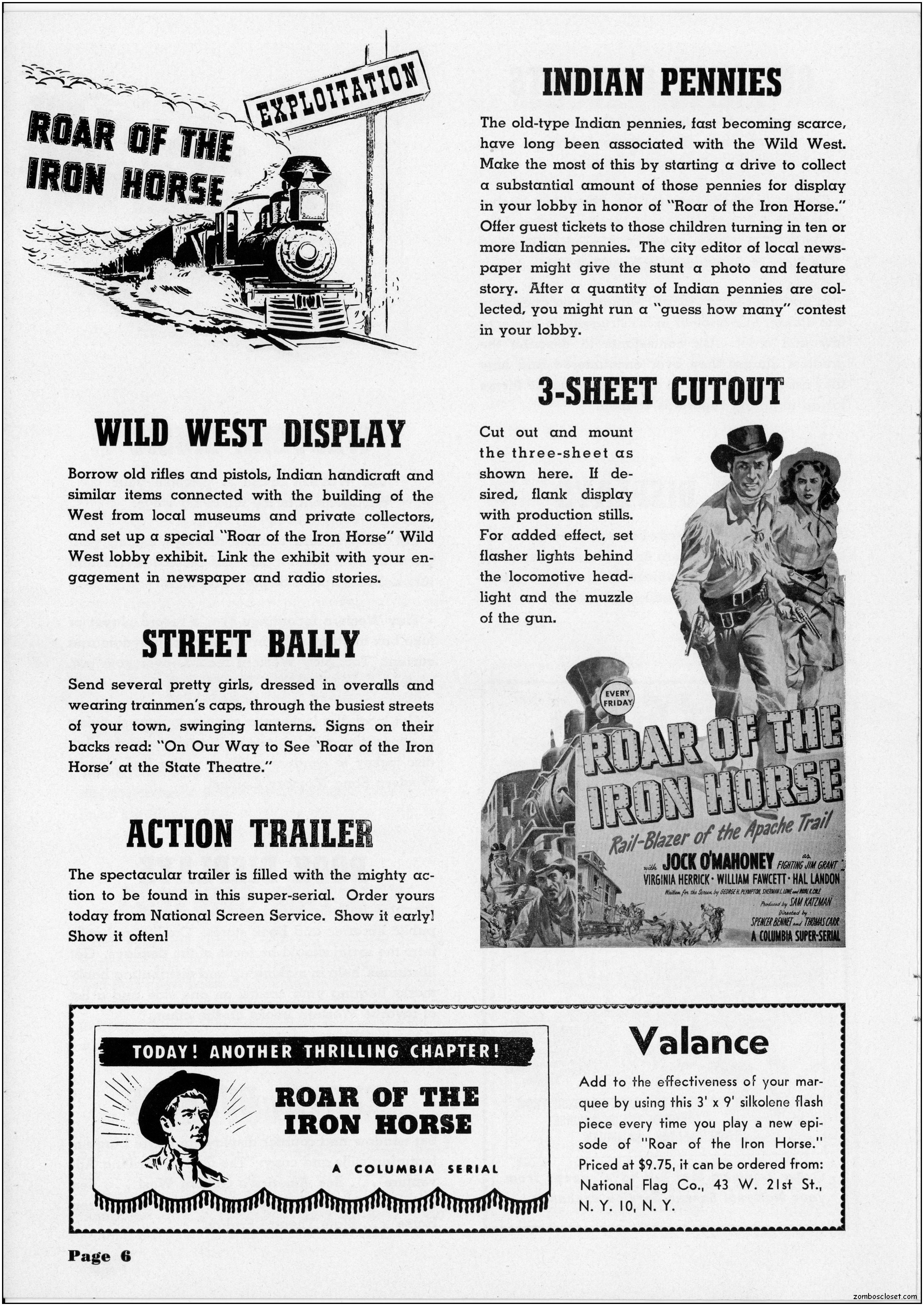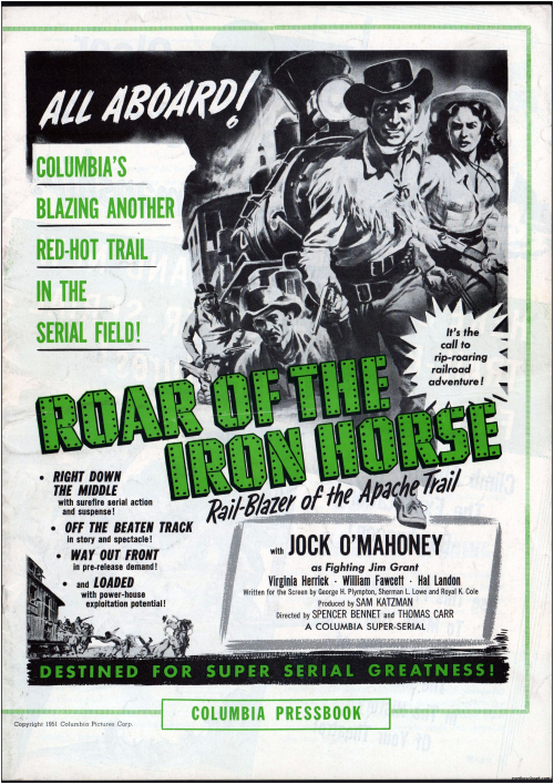 The pressbook for Roar of the Iron Horse contains a lot of promotional information and ideas. Of course, in the 1950s, cowboy movies were an easy draw for the younger set, until mutant monsters and atom bombs creeped out everyone enough to make the classic monsters in the 1960s more inviting. By then, science fiction and detective shows crowded out the Western dramas across television screens while the big screens showed less and less of them too. But in 1951, they were still roaring at the box office.