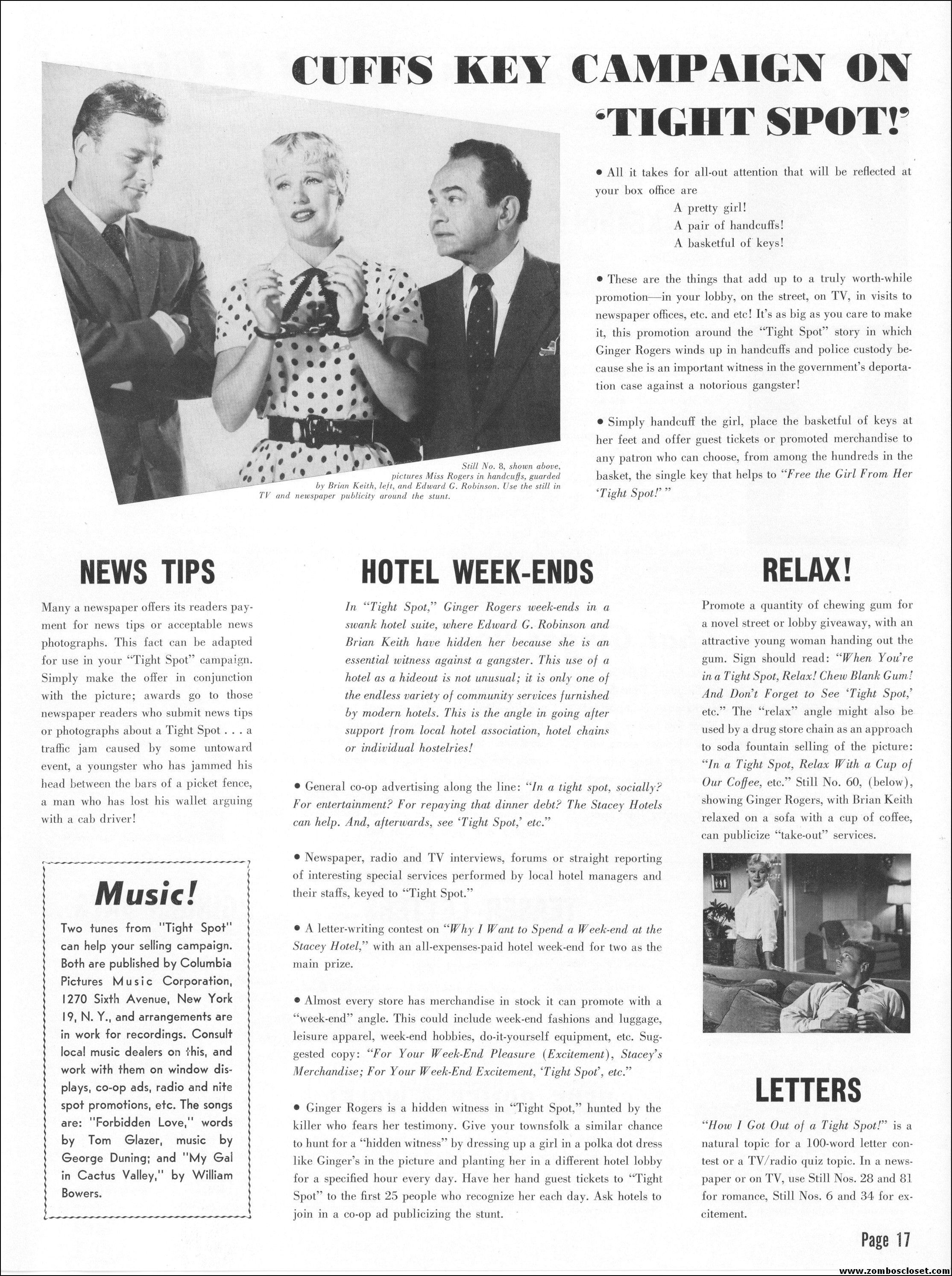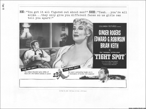 Like a little ginger cheesecake with your film noir? Here's Ginger Rogers in Tight Spot, a movie with some kick as she's manhandled by the cops and the criminals. Brian Keith plays the big lug who falls for her tight legs and snippy personality. Edward G. Robinson looks short in every scene but acts big as usual. The cast is gold, the dialog a bit too sappy, but this one's a keeper even without the dancing.