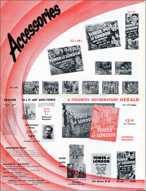 Here's another rare pressbook: Tower of London with Boris Karloff and Basil Rathbone. A wild and wonderful 17.5 x 23 inches when opened to read. I'm not sure if any pages are missing as I found this one in loose sheets. But what's here is still stellar. Aside from the auctions selling the covers alone, this original release pressbook has not been shown before. You lucky devils. Universal really overdid themselves with this one. The Showmanship page lists really cool theater lobby promos. You will need a big screen to view this beauty in all its glory.