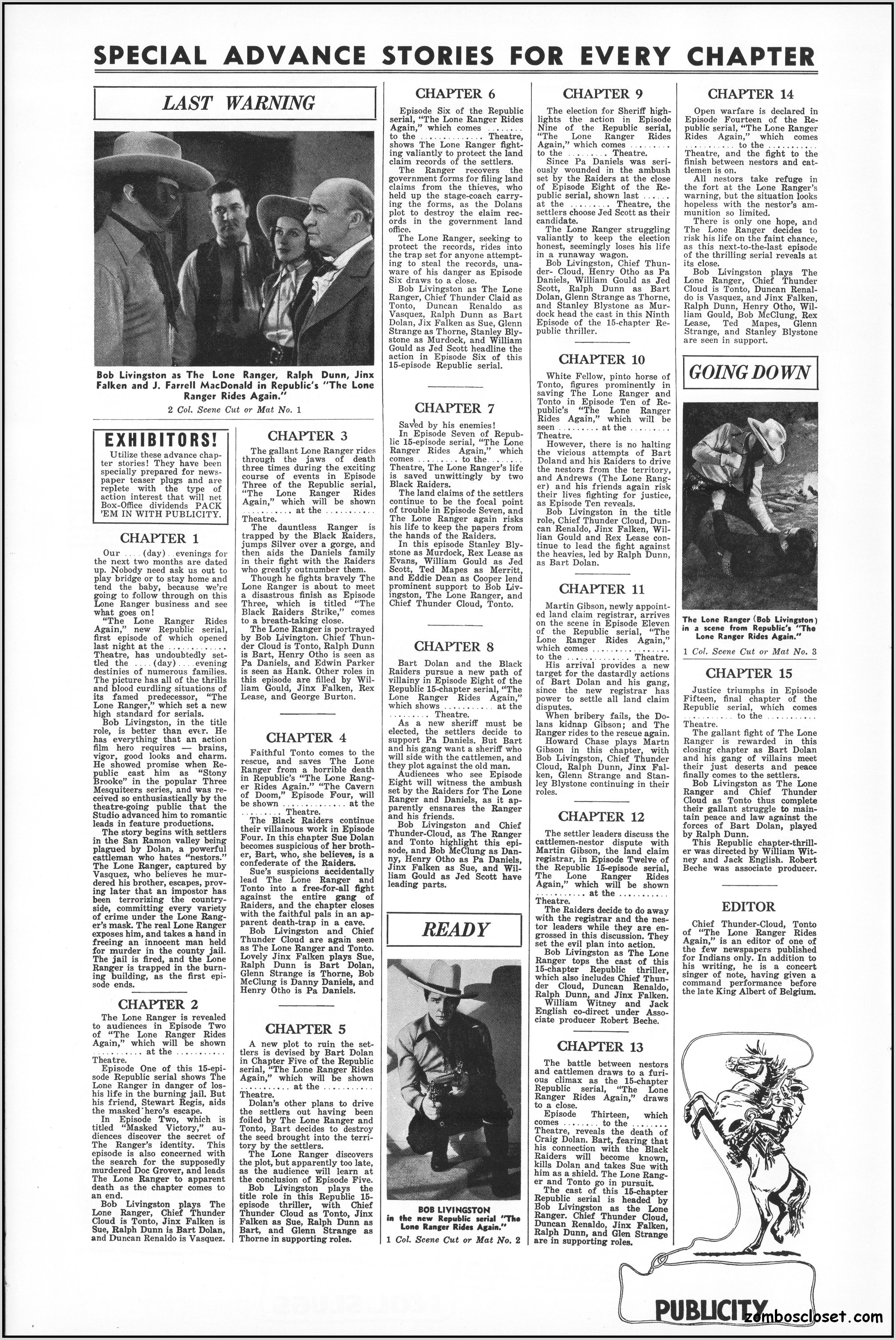 Here's is the tribute reproduction pressbook for The Lone Ranger Rides Again, produced by Jack Mathis in the 1970s. His tribute pressbooks pop up now and then in auctions that list them as the originals (he really did a good job), but his produced versions have slight differences. In this one, the inside covers are not in color, whereas the 1939 pressbook's are. I came to the Lone Ranger through the television show with Clayton Moore as the masked ranger and Jay Silverheels as Tonto. If you've seen the awful 2013 mess of a movie with Johnny Depp as Tonto, you haven't seen the real thing. While the television series was aimed at a young audience, they kept the relationship between the Lone Ranger and Tonto on a fairly equal footing, with both men relying on each other through trust and a strong ethical code. Funny, but the other important duo from television, Jim West and Artemis Gordon from The Wild Wild West also got screwed on the big screen with poor casting, poor scripting, and yet another cantankerous relationship that never existed in the original. What's it with Hollywood thinking friction-filled relationships are the only way to go big screen with characters like these?